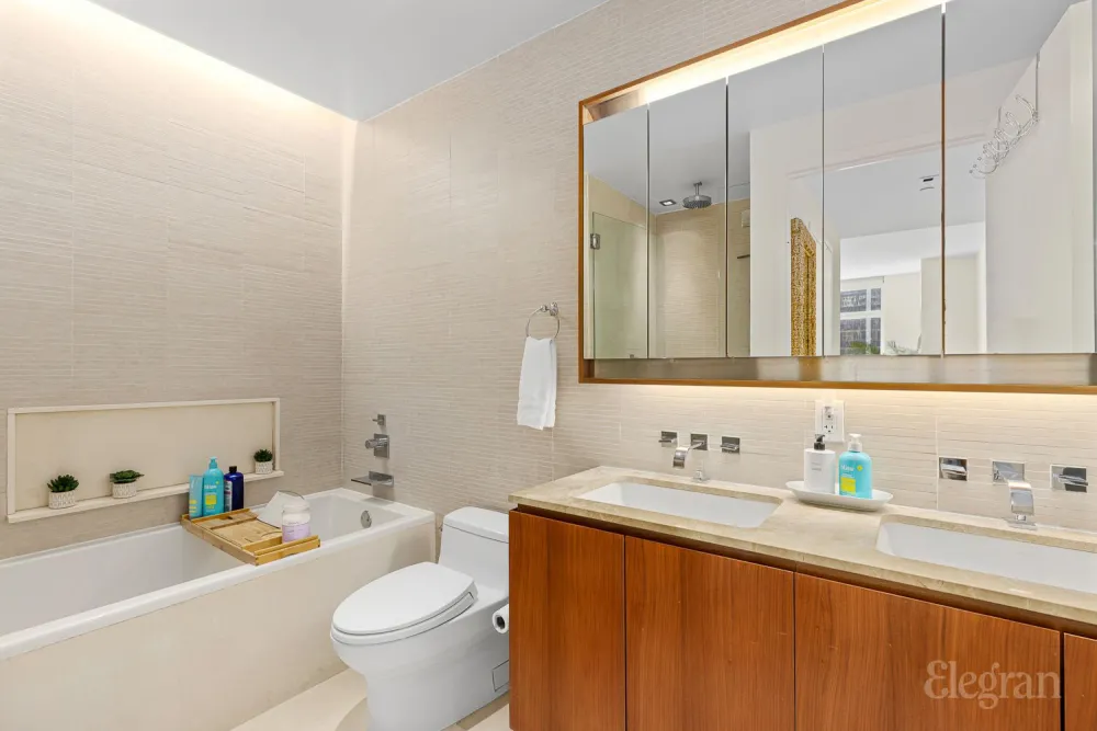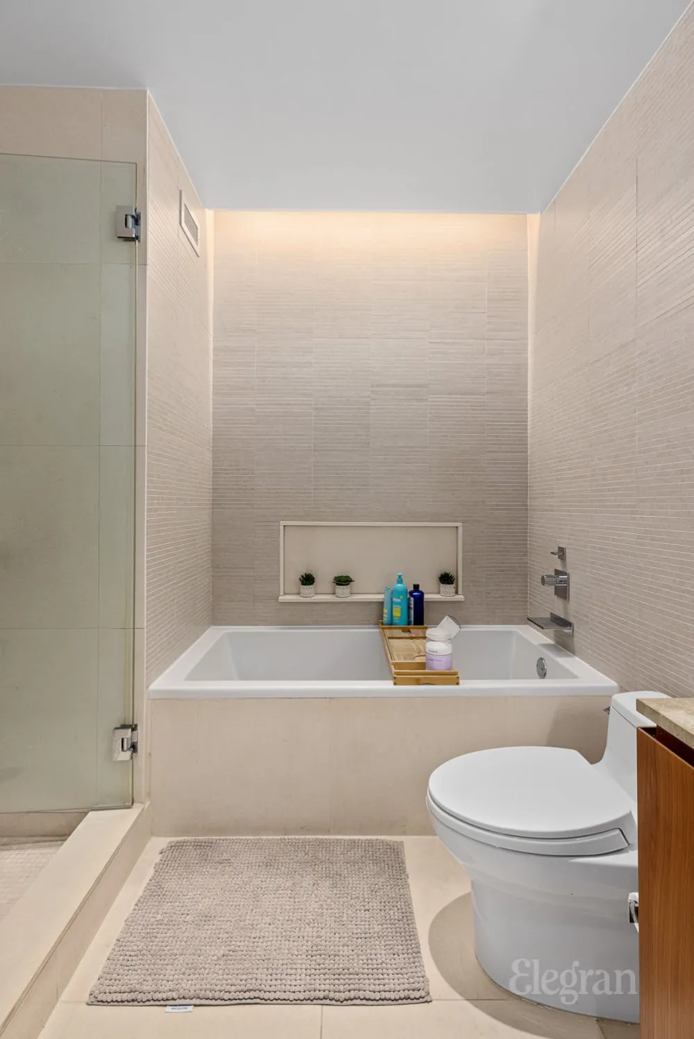 The expansive primary suite is a tranquil retreat, nearly matching the size of the living area, featuring a custom walk-in closet and a spa-inspired en suite bath. Indulge in a Zuma soaking tub, separate glass-enclosed shower, and dual vanity with exquisite marble countertops—an oasis of relaxation. The generous second bedroom also includes a walk-in closet and is complemented by a beautifully appointed full bath just across the hall. Additional conveniences include a Bosch stacked washer and dryer, ensuring effortless city living.