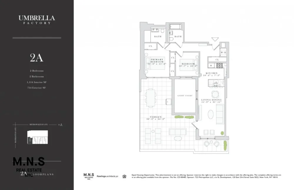 Now stаgеd! Umbrella Fасtοry'ѕ LΑRGEST PRIVATE OUΤDOΟR SPACE! Two-bedroom home with 12 1/2' lofted ceilings and a 714 sf private terrace w/ BBQ grill.Over 75% Sold and Close ASAP. Open daily, four on-site model residences, schedule your exclusive tour today! In the heart of residential Williamsburg sits a historic brick building on Metropolitan Avenue, a former 1943 umbrella factory still intact with its notable charm. Following a vision for utilitarian chic residences, this remarkable building’s dynamic narrative carries on with 69 stunning residential studios to three-bedroom loft condominiums.Residence 2A is one-of-a kind home at the Umbrella Factory - boasting the building's LARGEST PRIVATE OUTDOOR SPACE. The light, high ceilings and exposed timber beams are the first details you will notice as you enter. See below to learn more about the key features in the fantastic offering.Residence Features:• Wide Plank California Collection Select Grade Wood Flooring• Exposed Timber Construction• High Ceilings• Energy-Efficient Soundproof Rating Wausau & Kawneer Windows• Central Heating & Cooling• LG Washer & Dryer• Solid Core Doors w/ Matte Black Hardware• Bertazzoni Range• Fully Integrated Bosch Appliances• Marra Blanca Countertop and Backsplash• Custom Kitchen Cabinetry w/ Matte Black Hardware• Moen Matte Black Faucet• Under Cabinet LED Lighting• Signature Catalina Deep Soaking Tub• Toto Wall Mount Toilet• Wetstyle Custom SinkBuilding Amenities:• Doorman• Onsite Parking with EV-Charger• Fitness Center with Precor Equipment• Landscaped & Furnished Roof Deck w/ BBQ Station• Rooftop Dog Run• Individual Storage• Bike Storage• DogwashNeighborhood:Just blocks away from the busy Williamsburg waterfront, The Umbrella Factory sits steps from the L train in a coveted residential area of the famed neighborhood. With shopping, restaurants, nightlight galore, there is no shortage of amenities with the best of Williamsburg at your fingertips. The Umbrella Factory residents can be in Manhattan in less than 10 minutes with the Graham Avenue L train stop down the block.Images may be renderings or virtually staged, and/or represent model unit(s) and may not be reflective of the subject unit.Real estate taxes stated herein are estimates for the projected first year of condominium operation and do not reflect the building as fully completed. For further detail regarding anticipated increases in real estate taxes upon 100% completion of the building, prospective purchasers should review the Notes to Schedule A in the Offering Plan, as amended.Equal Housing Opportunity. All dimensions and square footages are approximate and subject to construction variances and may vary from floor to floor. Images are renderings and may not be reflective of the layout of the subject residence in this advertisement. This advertisement is not an offering. Sponsor reserves the right to make changes in accordance with the offering plan. The complete offering terms are in an offering plan available from the Sponsor. File No. CD18-0482. Sponsor: 722 Metropolitan LLC c/o SL Development 1178 Broadway, 3rd Floor #1321 New York, NY 10001.
