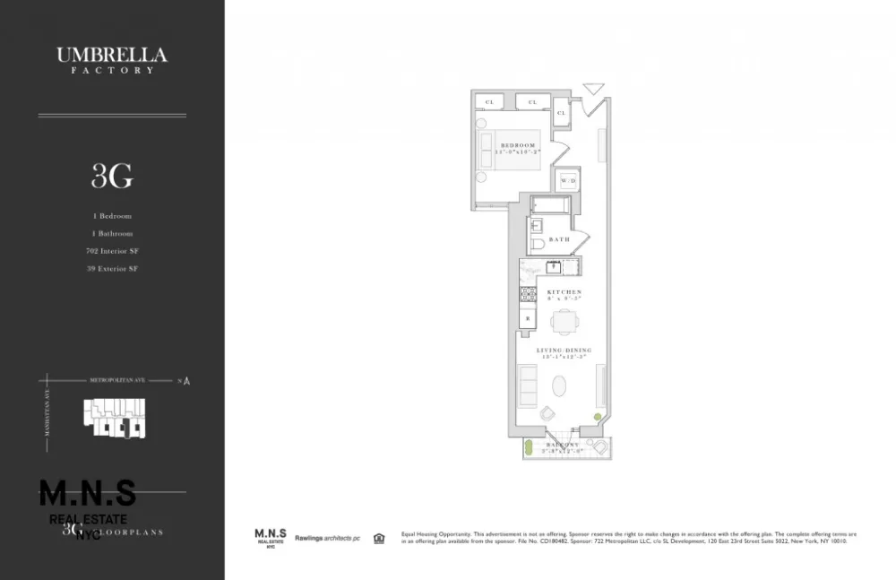 CLOSΙΝGS HΑVΕ CΟMΜEΝCED!Open daily, schеdule уour exclusive tour today! Three on-site model residences now available for viewing.In the heart of residential Williamsburg sits a historic brick building on Metropolitan Avenue, a former 1943 umbrella factory still intact with its notable charm. Following a vision for utilitarian chic residences, this remarkable building’s dynamic narrative carries on with 69 stunning residential studios to three-bedroom loft condominiums.True loft living! Residence 3G is a large one-bedroom home with incredibly high ceilings, private outdoor space and Southern exposure. The high ceilings and exposed timber beams are the first details you will notice as you enter. See below to learn more about the key features in the fantastic offering.Residence Features:• Wide Plank California Collection Select Grade Wood Flooring• Exposed Timber Construction• High Ceilings• Energy-Efficient Soundproof Rating Wausau & Kawneer Windows• Central Heating & Cooling• Bosch Washer & Dryer• Solid Core Doors w/ Matte Black Hardware• Bertazzoni Range• Fully Integrated Bosch Appliances• Marra Blanca Countertop and Backsplash• Custom Kitchen Cabinetry w/ Matte Black Hardware• Moen Matte Black Faucet• Under Cabinet LED Lighting• Signature Catalina Deep Soaking Tub• Toto Wall Mount Toilet• Wetstyle Custom SinkBuilding Amenities:• Doorman• Onsite Parking• Gym• Landscaped & Furnished Roof Deck w/ BBQ Station• Rooftop Dog Run• Individual Storage• Bike Storage• DogwashNeighborhood:Just blocks away from the busy Williamsburg waterfront, The Umbrella Factory sits steps from the L train in a coveted residential area of the famed neighborhood. With shopping, restaurants, nightlight galore, there is no shortage of amenities with the best of Williamsburg at your fingertips. The Umbrella Factory residents can be in Manhattan in less than 10 minutes with the Graham Avenue L train stop down the block.Images & renderings represent model unit(s) and may not be reflective of the subject unit. Real estate taxes stated herein are estimates for the projected first year of condominium operation and do not reflect the building as fully completed. For further detail regarding anticipated increases in real estate taxes upon 100% completion of the building, prospective purchasers should review the Notes to Schedule A in the Offering Plan, as amended.Equal Housing Opportunity. All dimensions and square footages are approximate and subject to construction variances and may vary from floor to floor. Images are renderings and may not be reflective of the layout of the subject residence in this advertisement. This advertisement is not an offering. Sponsor reserves the right to make changes in accordance with the offering plan. The complete offering terms are in an offering plan available from the Sponsor. File No. CD18-0482. Sponsor: 722 Metropolitan LLC c/o SL Development 1178 Broadway, 3rd Floor #1321 New York, NY 10001.