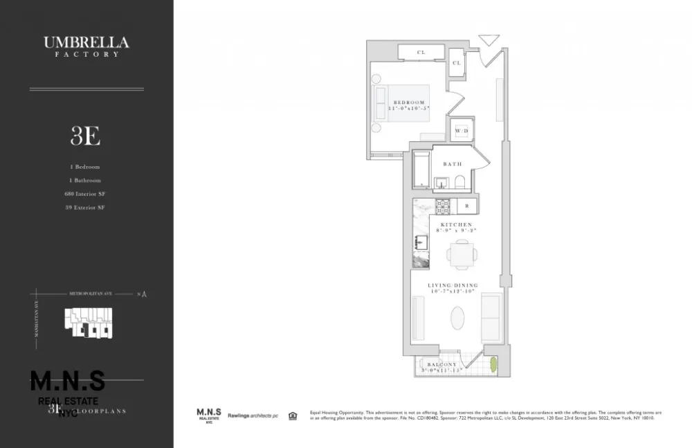 Now OVΕR 80% Ѕold - Clοѕе AЅAΡ. Open daily, four on-ѕitе model residences, schedule your exclusive tour today!In the heart of residential Williamsburg sits a historic brick building on Metropolitan Avenue, a former 1943 umbrella factory still intact with its notable charm. Following a vision for utilitarian chic residences, this remarkable building’s dynamic narrative carries on with 69 stunning residential studios to three-bedroom loft condominiums.True loft living! Residence 3E is prefect one-bedroom layout with an open kitchen, private outdoor space and ample storage. The high ceilings and exposed timber beams are the first details you will notice as you enter. See below to learn more about the key features in the fantastic offering.Residence Features:• Wide Plank California Collection Select Grade Wood Flooring• Exposed Timber Construction• High Ceilings• Energy-Efficient Soundproof Rating Wausau & Kawneer Windows• Central Heating & Cooling• LG Washer & Dryer• Solid Core Doors w/ Matte Black Hardware• Bertazzoni Range• Fully Integrated Bosch Appliances• Marra Blanca Countertop and Backsplash• Custom Kitchen Cabinetry w/ Matte Black Hardware• Moen Matte Black Faucet• Under Cabinet LED Lighting• Signature Catalina Deep Soaking Tub• Toto Wall Mount Toilet• Wetstyle Custom SinkBuilding Amenities:• Doorman• Onsite Parking with EV-Charger• Fitness Center with Precor Equipment• Landscaped & Furnished Roof Deck w/ BBQ Station• Rooftop Dog Run• Individual Storage• Bike Storage• DogwashNeighborhood:Just blocks away from the busy Williamsburg waterfront, The Umbrella Factory sits steps from the L train in a coveted residential area of the famed neighborhood. With shopping, restaurants, nightlight galore, there is no shortage of amenities with the best of Williamsburg at your fingertips. The Umbrella Factory residents can be in Manhattan in less than 10 minutes with the Graham Avenue L train stop down the block.Images & renderings represent model unit(s) and may not be reflective of the subject unit. Real estate taxes stated herein are estimates for the projected first year of condominium operation and do not reflect the building as fully completed. For further detail regarding anticipated increases in real estate taxes upon 100% completion of the building, prospective purchasers should review the Notes to Schedule A in the Offering Plan, as amended.Equal Housing Opportunity. All dimensions and square footages are approximate and subject to construction variances and may vary from floor to floor. Images are renderings and may not be reflective of the layout of the subject residence in this advertisement. This advertisement is not an offering. Sponsor reserves the right to make changes in accordance with the offering plan. The complete offering terms are in an offering plan available from the Sponsor. File No. CD18-0482. Sponsor: 722 Metropolitan LLC c/o SL Development 1178 Broadway, 3rd Floor #1321 New York, NY 10001