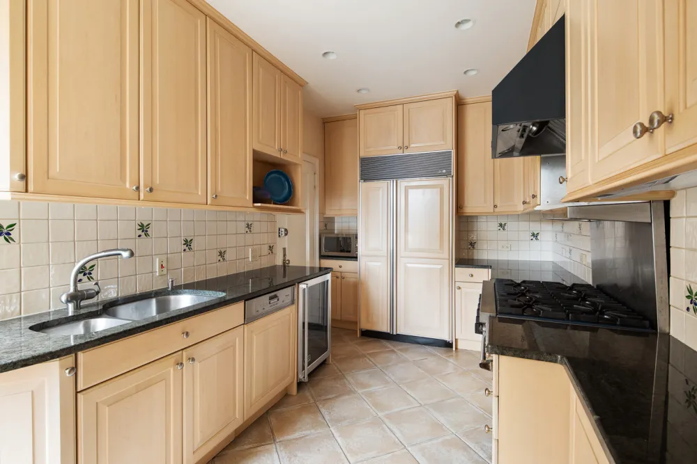 The chef's kitchen is a culinary delight, featuring a 6-burner Viking range, a 42-inch Sub-Zero refrigerator, custom cabinetry, granite counters, Italian ceramic-tile flooring, and a charming backsplash adorned with hand-painted tiles from Provence.