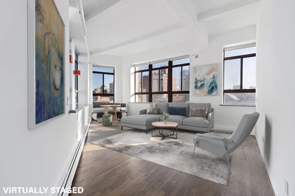Rarely Available High Floor Sun-Soaked CONDO with High Ceilings and Central AC in the Prime West Village!This corner loft has a unique triangular layout which maximizes natural light and open views in each room. The grand space features 11+ foot beamed ceilings and is surrounded by 19 windows which provide open panoramic views of the Hudson Yards and Midtown skyline. The layout is excellent, with a gracious entrance foyer and dining area that flows seamlessly into a large great room bathed in natural light. The kitchen features stainless steel appliances, granite countertops and multiple levels of vertical cabinetry, taking advantage of the high ceilings. Both bedrooms have Citiquiet soundproof windows and substantial closet space. Both bathrooms are clad with black granite tiling and have modern white fixtures, including a deep soaking jacuzzi tub in the primary and a stand up shower in the secondary. Other features of this home include hard wood floors throughout, central air conditioning controlled by Nest thermostats and an in-unit washer/dryer.2 Cornelia Street is a boutique flatiron-shaped condominium building designed by prominent NYC-based architect, Stephen Jacobs, originally with 43 units, but many have since been combined. Amenities include a 24-hour doorman, live-in super, central laundry room and spectacular roof deck. Centrally located and convenient to nearly every subway line, the one-block long Cornelia Street is also one of NYC's quietest and prettiest tree-lined streets, with its gorgeous townhouses, carriage houses and quaint cafes. And sandwiched between Bleecker and West 4th Street, it is very much the epitome of West Village living at its finest.Find out why Taylor Swift loved living on Cornelia Street and come see this unit today!
