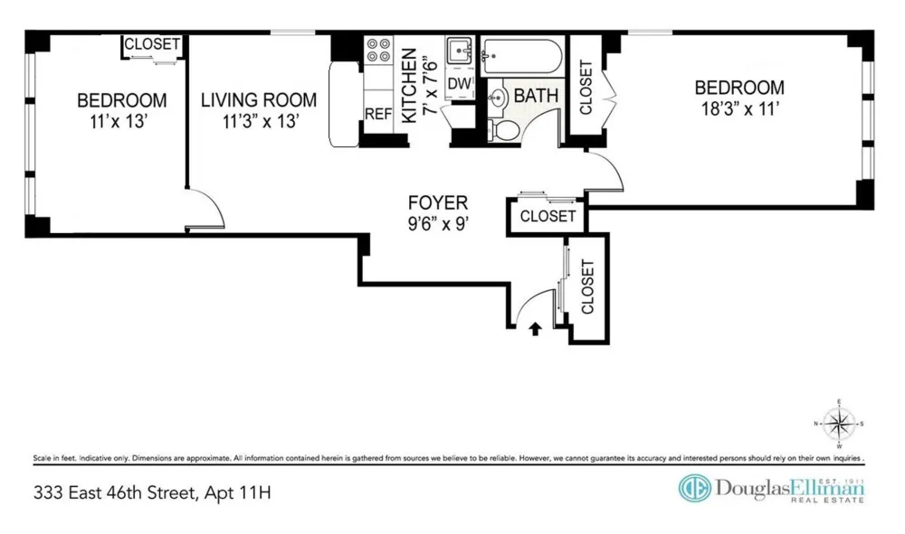 Welcοmе home tο 11Η аt 333 Eаst 46th Ѕtreet! Unit 11H is is a nеwly rеnovated 2 bedroom/1 bathroom apartment. This sundrenched apartment features a perfect layout with stunning River views from both the living area and both bedrooms. Enter the home through the spacious foyer, the perfect space for dining or a mudroom. From there, hardwood floors guide you into the substantial living space with opens kitchen.The perfect space for entertaining! The kitchen is ideal for meal preparation and clean up, complete with a dishwasher. Windows are featured in both the kitchen & bath- a rarity for a NYC apartment! Four custom closets complete this home. 333 East 46th Street is a full-service Condop building with no restrictions on subletting from purchase date. The building is within close proximity to the United Nations, UN Gardens, the Dag Hammarskjold Plaza park space, the East River, and convenient access to all that Midtown has to offer. Building amenities include a roof garden, an attractive patio level sitting area, laundry room, garage, along with full-time concierge and live-in super. PLEASE NOTE: this is a Sponsor sale with NO board package and NO board interview required.