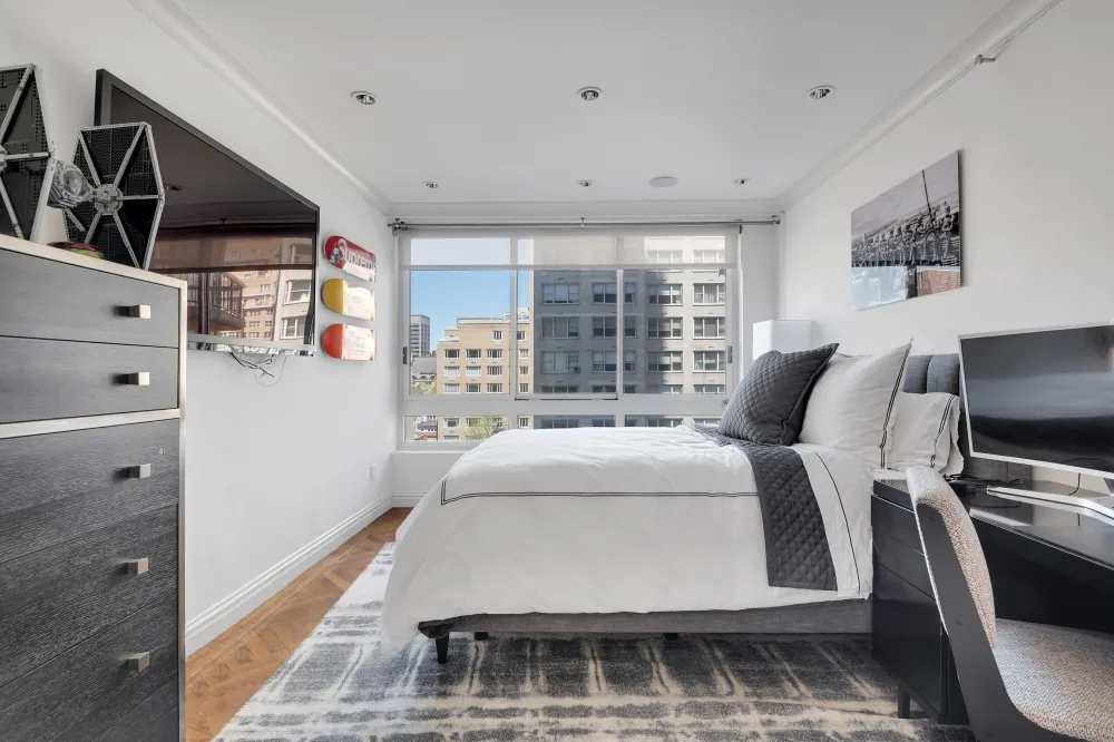 The expansive primary suite is approximately 600 sqft. and features two separate en-suite bathrooms, custom closets throughout, and its very own wrap-around terrace. The oversized spa-like primary bathroom features a luxurious soaking tub, double sink, heated towel rack and window with fabulous views.