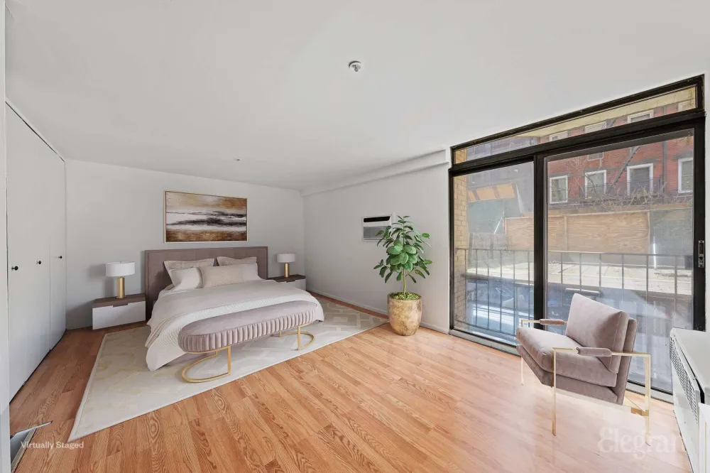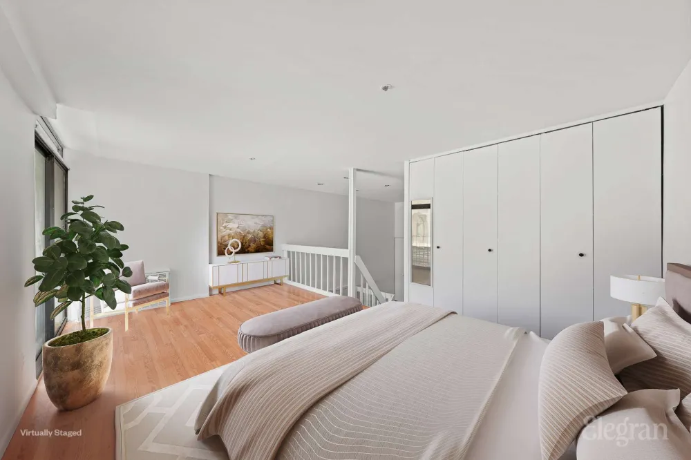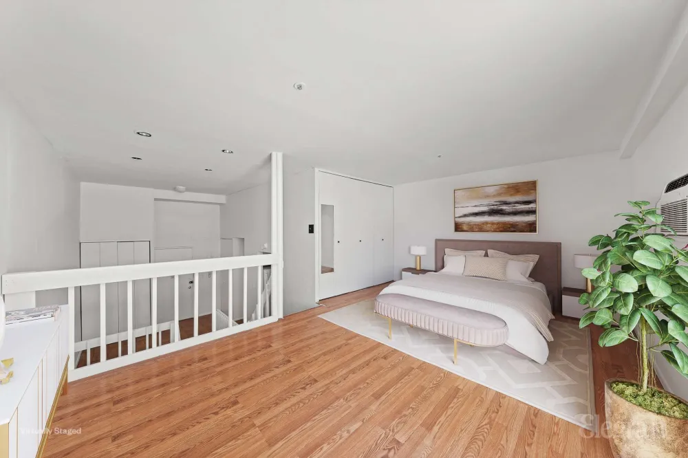 A charming staircase leads you upstairs to the large  bedroom that features floor to ceiling windows, XL closets and hard wood floors. The ceiling height on this floor is 8 ft.