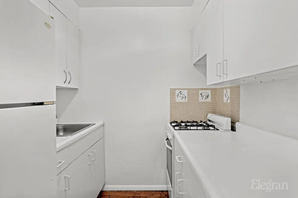 Upon entering the apartment  you will be on the middle level, where you will be welcomed by a cozy dining nook, a galley kitchen, bathroom and multiple closets.
