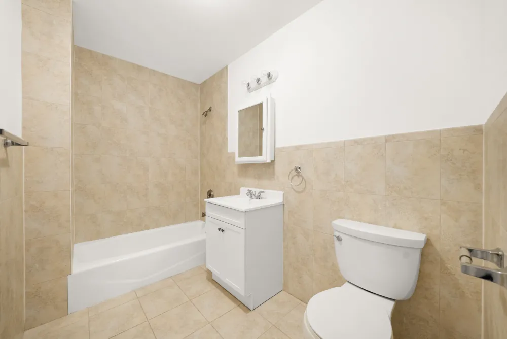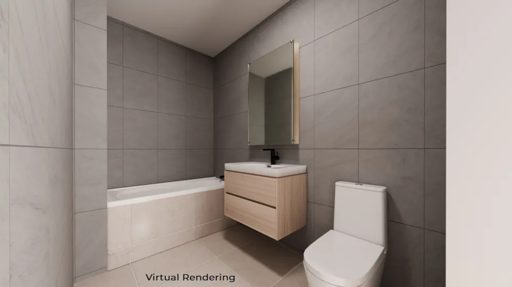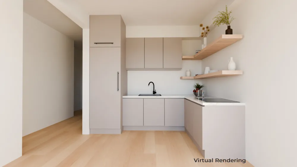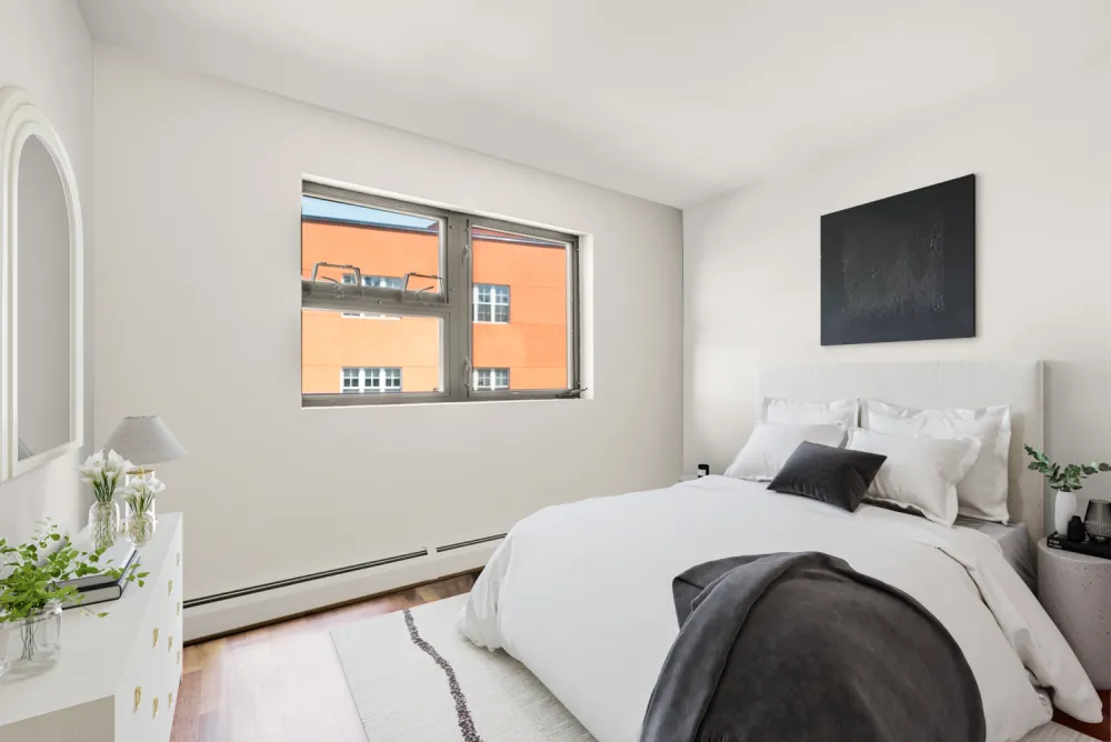 Residence 5A features a spacious one-bedroom, one-bathroom layout encompassing 617 SF of interior space. The generously sized bedroom comfortably accommodates a king-sized bed. This apartment includes modern conveniences, such as a thru-wall AC and a dishwasher. Additionally, it boasts a private northern balcony overlooking a serene garden, providing a peaceful retreat.