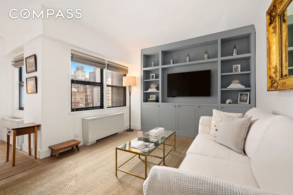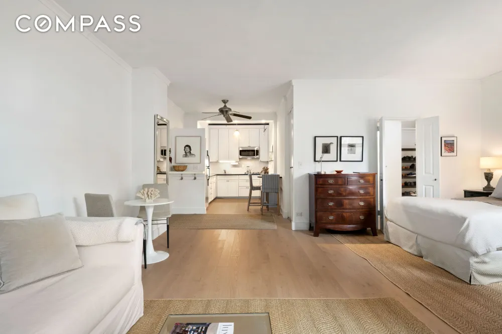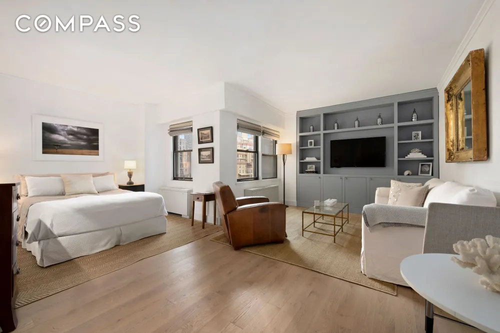 Located on the 12th floor, this spacious home enjoys taller-than-average 9-foot-high ceilings, northern and eastern exposures, and an extremely quiet position at the rear of the building. A gracious foyer welcomes you inside to discover brand-new white oak floors and a roomy coat closet. The beautifully renovated and expanded open kitchen impresses with custom cabinetry, honed black granite counters, stainless steel appliances, and a dining counter that’s perfect for casual dining. Ahead, the main living space flows to a wall of gorgeous built-ins with a TV niche, cabinets and shelving. From the sleeping area, two huge closets, including a walk-in, lead to a renovated full bathroom. Currently configured as an open alcove studio, this generous layout easily converts to a true one-bedroom layout, as many other M-line residents have done.