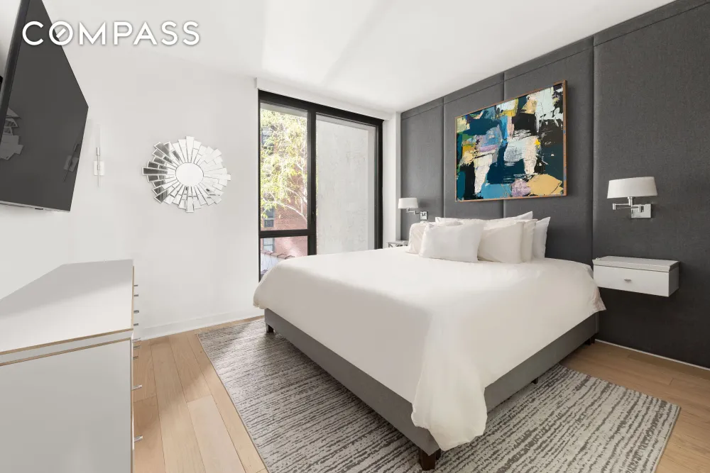 Exuding sophistication and abundant natural light, this impeccably designed 1-bedroom, 1-bathroom floor-through loft like apartment epitomizes modern city living. Spanning 850 square feet, the residence features wide-plank oak flooring, floor-to-ceiling windows with northern and southern exposures, multi-zone central climate control, custom closets, a built-in workstation, and an in-unit washer and dryer.