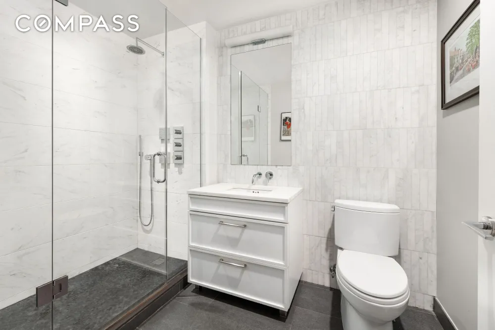 Quiet and sunlit, the south-facing bedroom offers a walk-in California closet, built-in storage, a lighted vanity, and direct access to a spa-like bathroom appointed with marble walls, radiant heated floors, and a walk-in shower featuring multiple shower heads.
