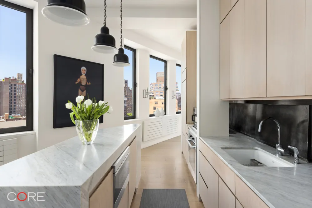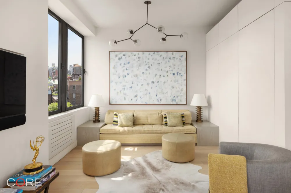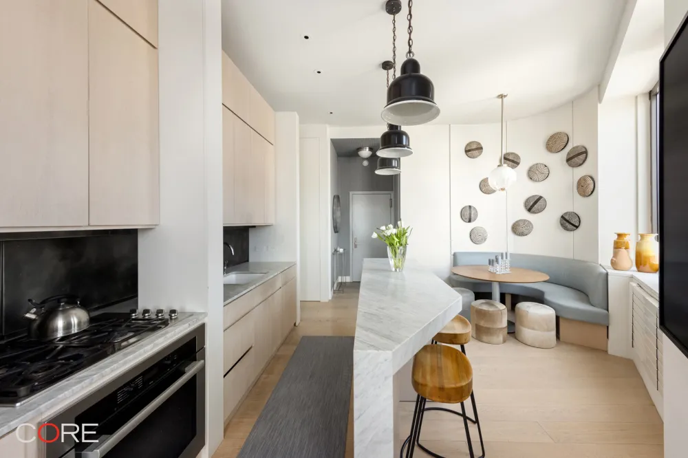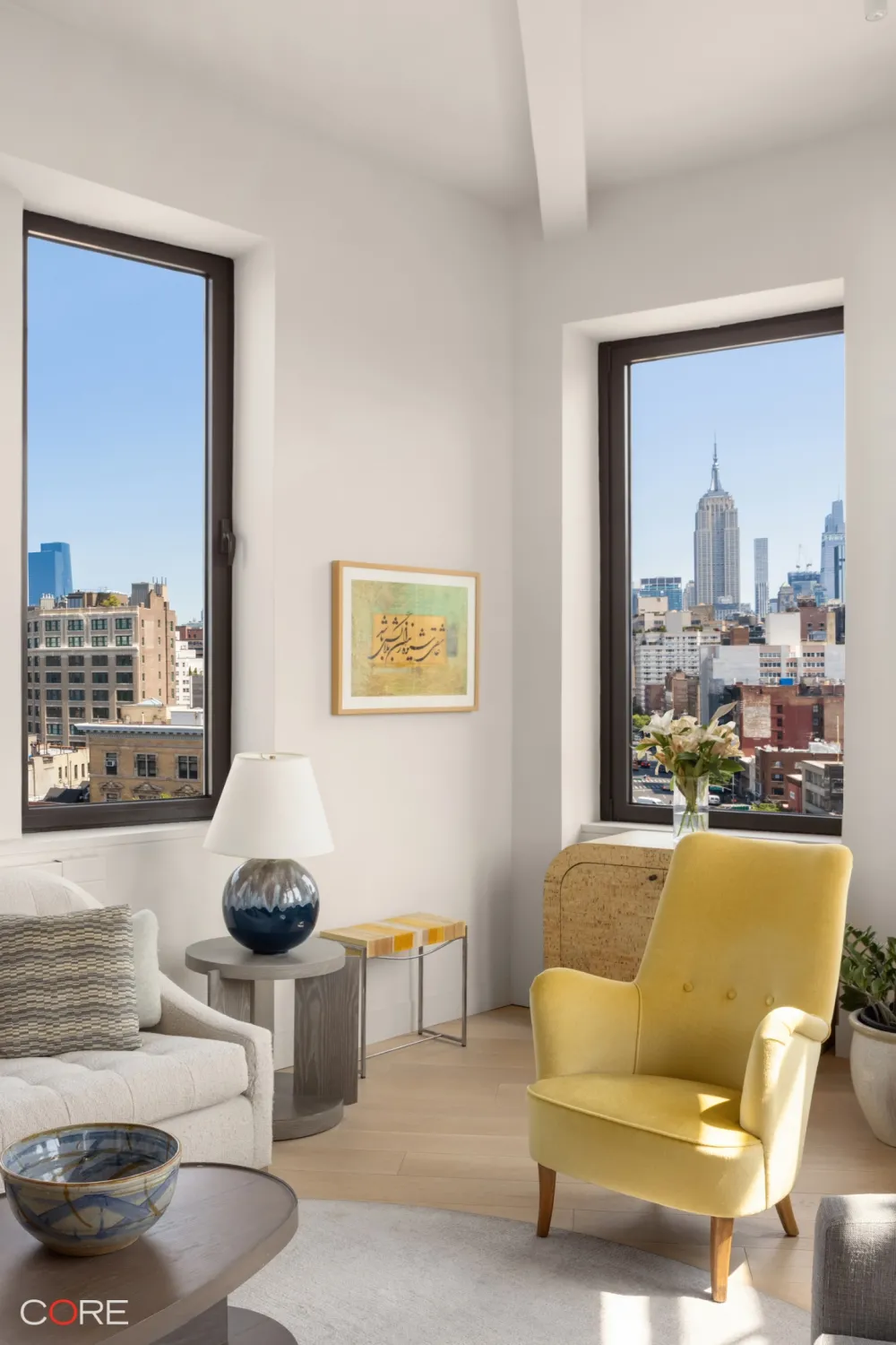 A hallway gallery leads you into the triangular living areas, offering picturesque and protected views of the Empire State Building to the north, western exposures of Hudson Yards and beyond, and beautiful city vistas to the east.
