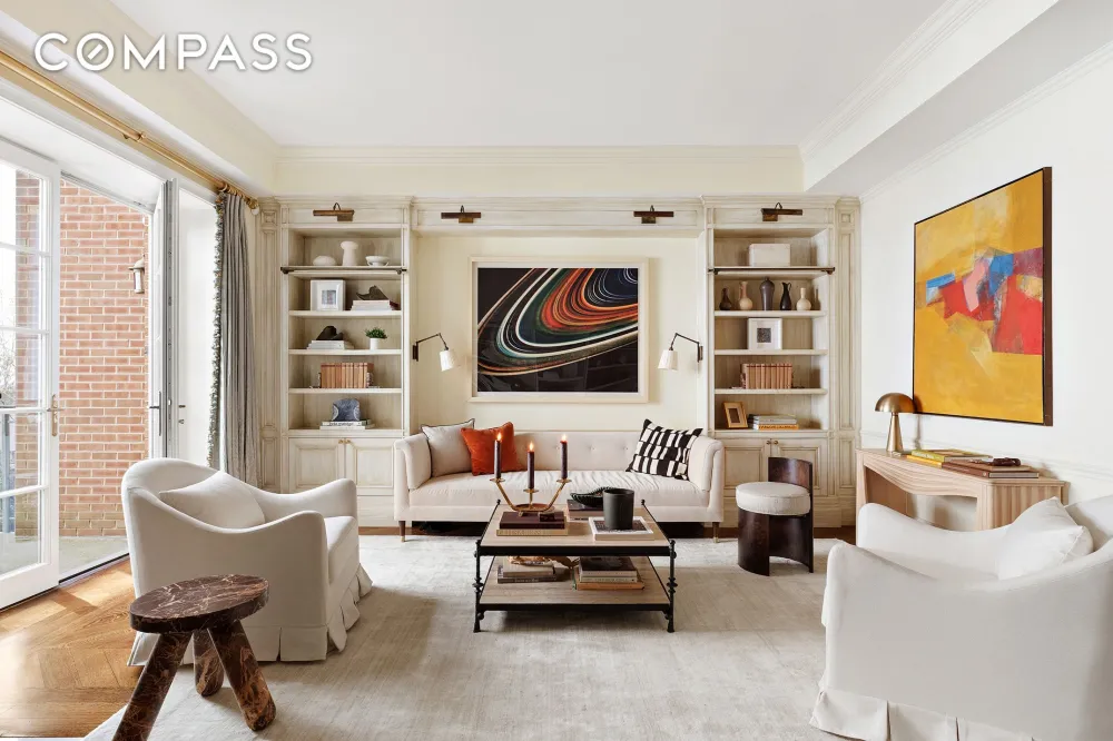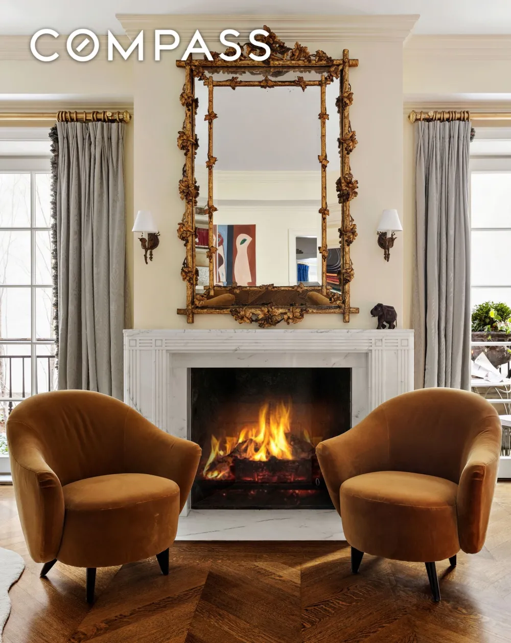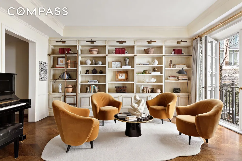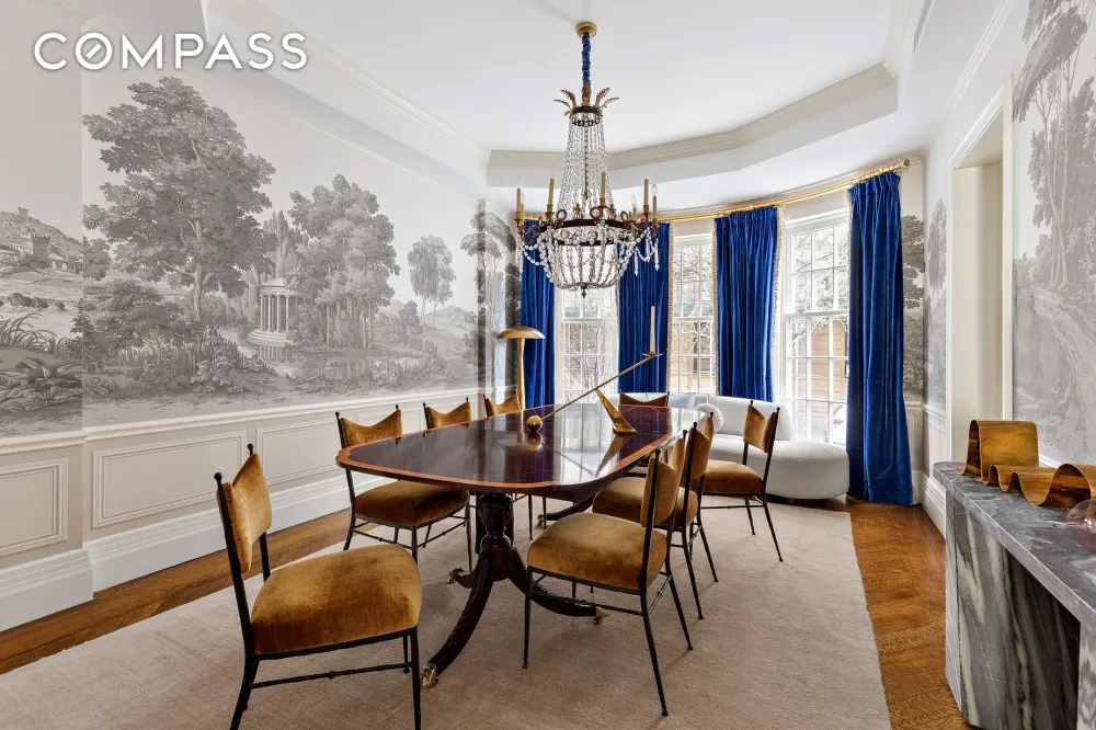The second level houses the enormous primary suite. There is a large bedroom, with an en-suite stunning five-piece marble bathroom with heated floors, a separate soaking tub and water closet. The Parisian-inspired dressing room is any Manhattan owner's dream: fully built out and the size of a bedroom (also with custom Zuber wall-coverings) with an additional back walk-in closet that can be used for bags, shoes, or additional clothing. There are many more closets spaced throughout this floor and a night kitchen for coffee and a built-in refrigerator.