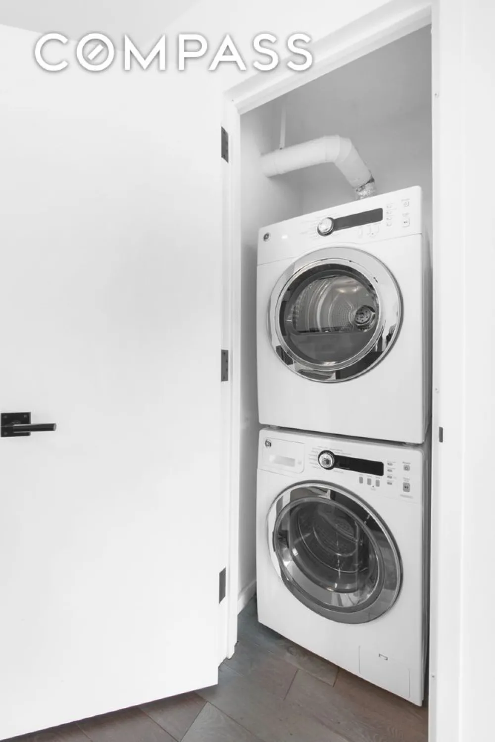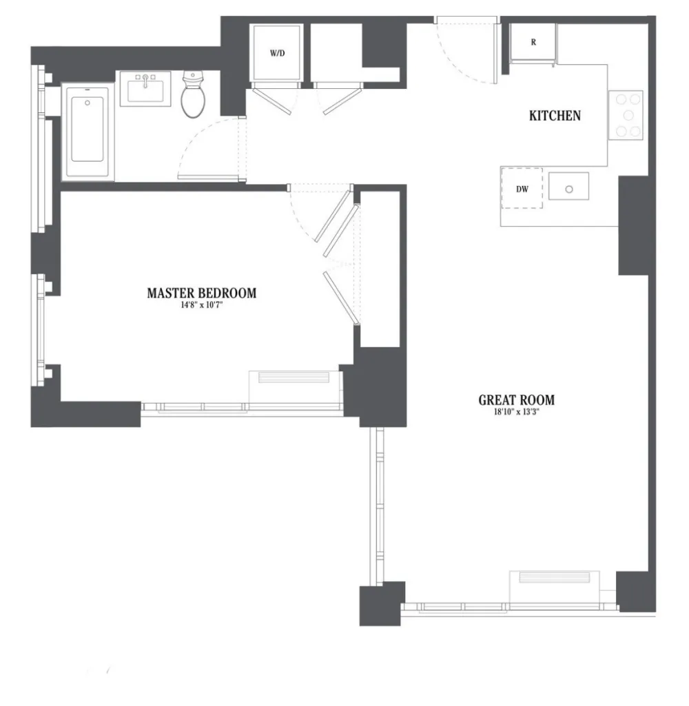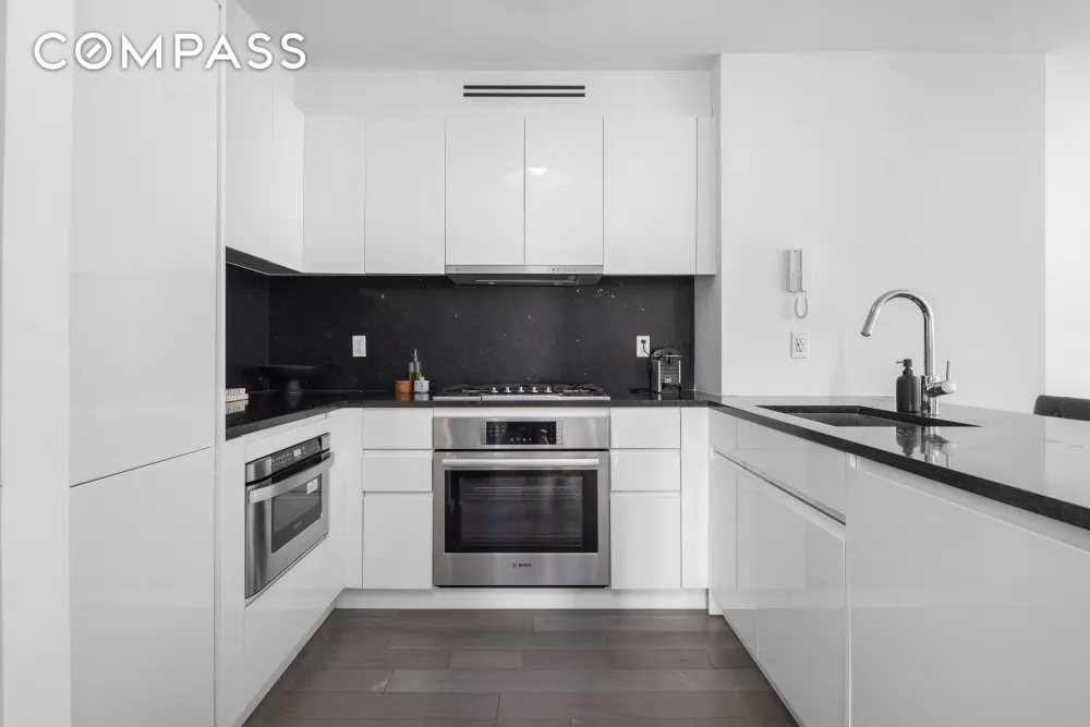 The open kitchen optimizes light and functional mobility. It’s perfect for entertaining, without sacrificing any creature comforts. The countertops and backsplash feature sleek honed Petite Granite. The solid wood cabinetry is finished in a custom white lacquer. Top-of-the-line appliances include a Sub-Zero refrigerator, as well as a vented Bosch range, oven, and dishwasher. Five-inch wide, oak hardwood floors grace the entire apartment. The apartment comes with a washer and vented dryer already installed. A through-wall HVAC unit hides away discretely in a custom white lacquer cabinet.