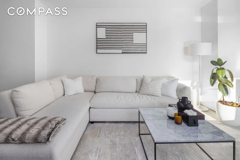 The bright, double-exposure bedroom is King-sized, allowing a wealth of natural light and serenity. The bedroom comes outfitted with a large California closet. The spacious windowed bathroom has floors and tiles laid with a honed Grey Fume marble. A custom-designed Ash vanity, accented with a blackened steel frame, tastefully separates the full-size tub and Toto toilet. This bathroom showcases Waterworks fixtures, finished in a polished nickel.