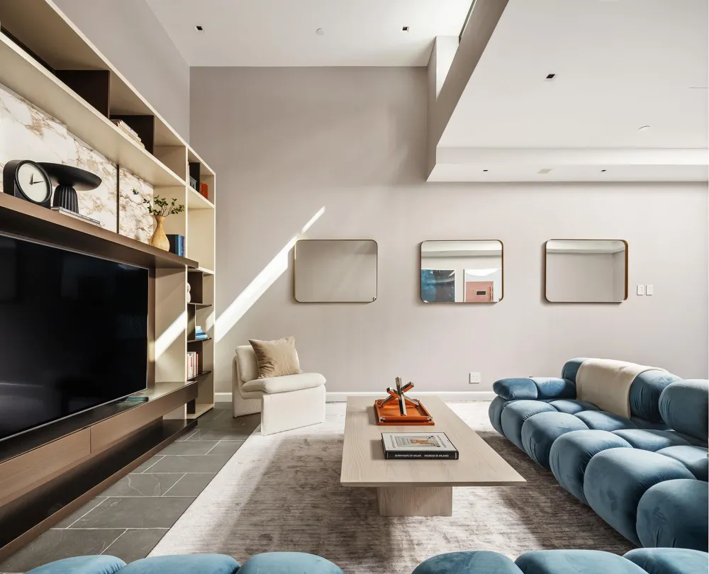 The custom-designed kitchen is a true showpiece, featuring Italian Arclinea cabinetry, Calacatta Borghini marble countertops, and top-of-the-line Sub-Zero and Miele appliances. A striking double-height black steel window wall floods the space with natural light and frames breathtaking views of the lush, south-facing tiered garden-a private sanctuary with an outdoor kitchenette, natural gas BBQ, large seating area, and beautifully landscaped planters.