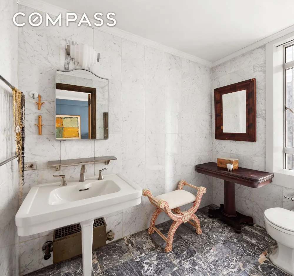 Both bedrooms in the residence offer classic pre-war scale, timeless moldings, and generous closet space. The bathrooms, one of which is en-suite off the primary bedroom, offer a classic elegance with moments of playful design.