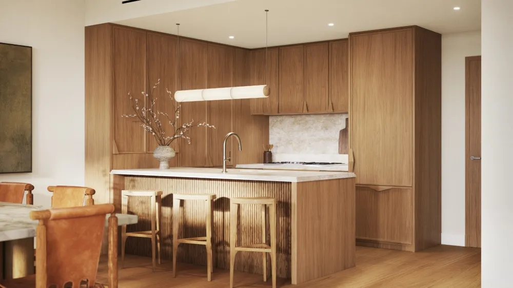 Designed with a focus on simplicity as a way of life, with interiors designed by AD100 Workstead that layer elegance and function that feel intimate in scale and have a soft calming effect. The kitchen presents custom white oak cabinetry adorned with custom white oak hardware that is beautifully paired with a striking honed Taj Mahal quartzite countertop, backsplash and ledge. The integrated Bosch appliance suite blends seamlessly into the background and calls attention to the many thoughtful design details.