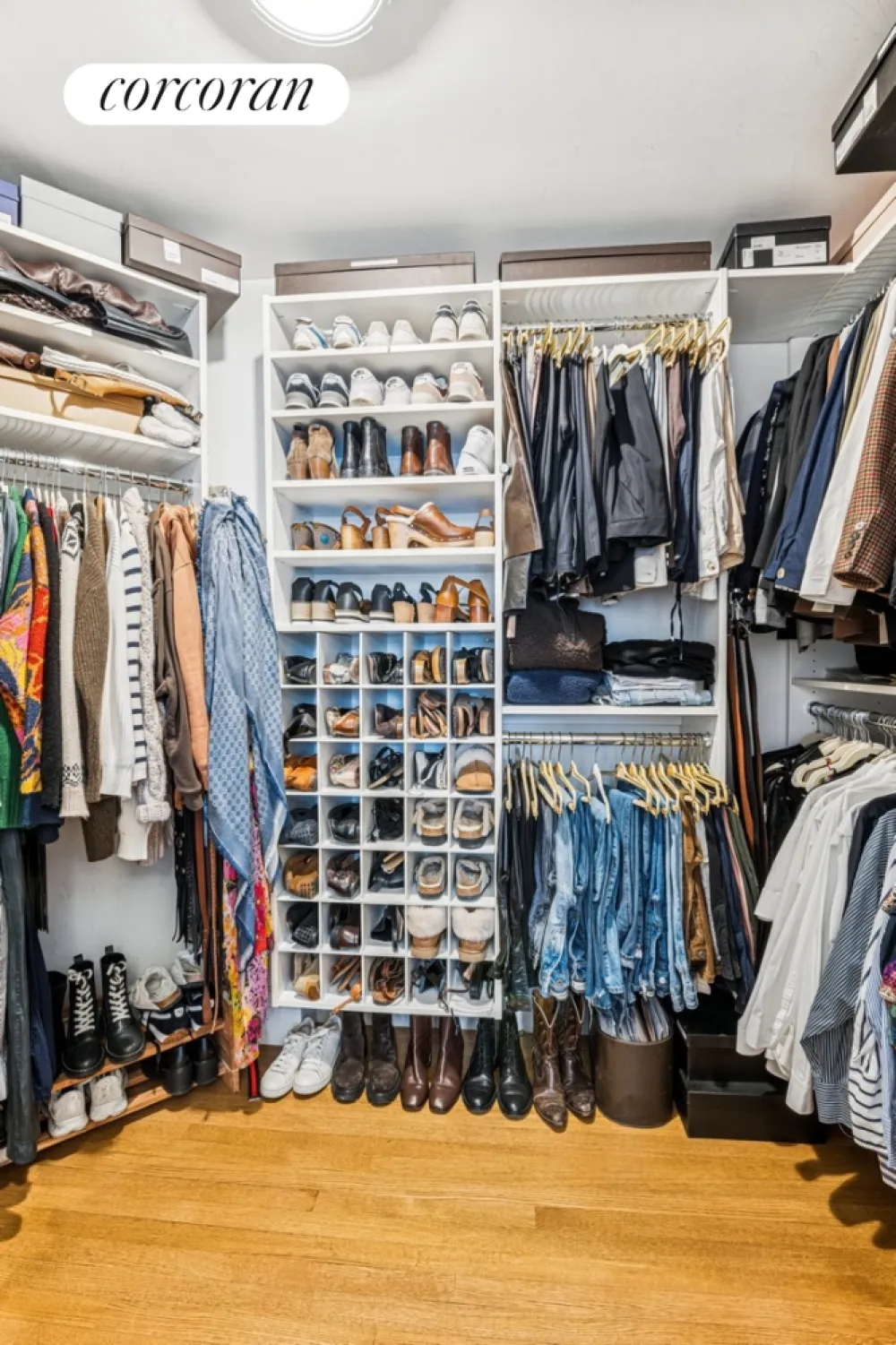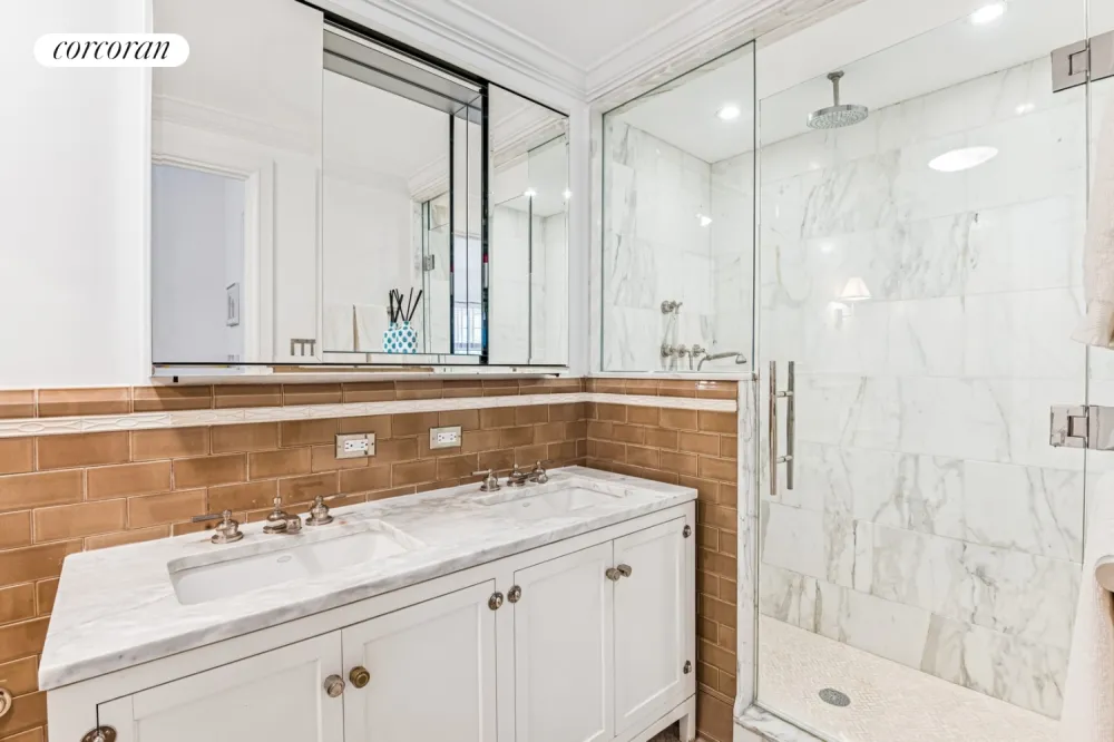 The primary bedroom nestled in the far corner of this apartment has an enormous walk-in closet and a luxurious bathroom with a custom vanity with dual sinks and a marble spa-like shower. The second and third bedrooms share a common bathroom just opposite the hallway.