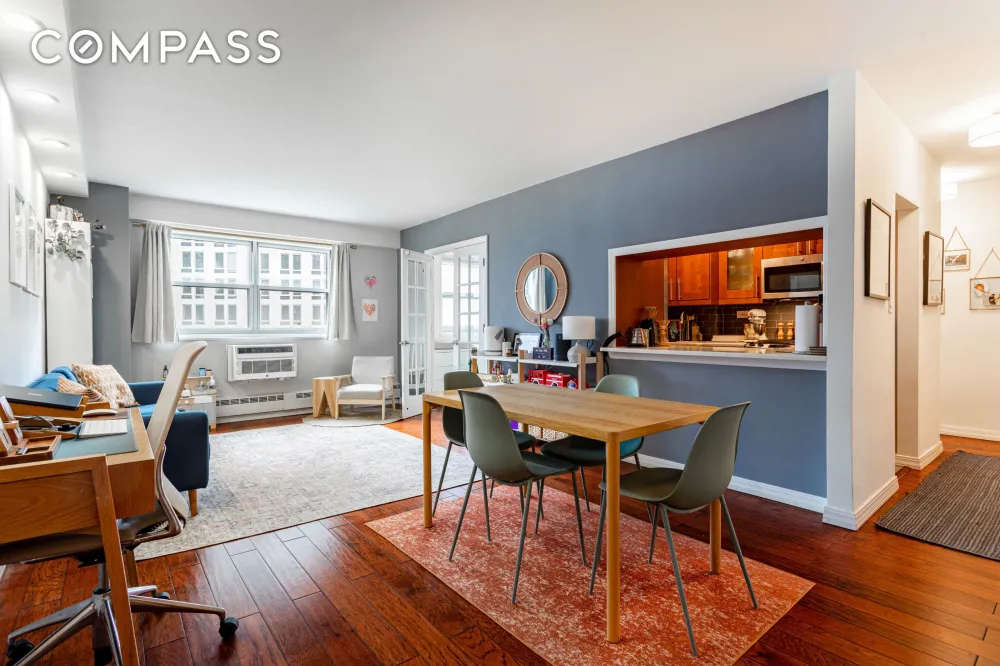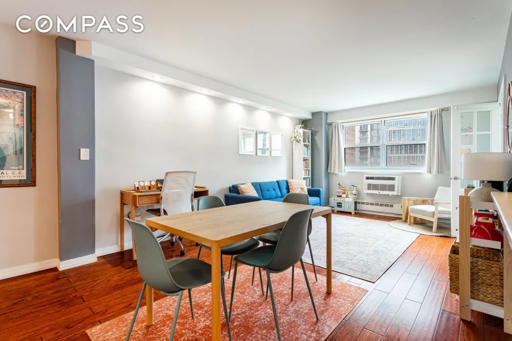 Bright and Spacious Layout: Enjoy abundant natural light from western and northern exposures, complemented by beautiful hardwood floors. The expansive living and dining areas accommodate a 6-person table, perfect for gatherings or relaxing evenings.