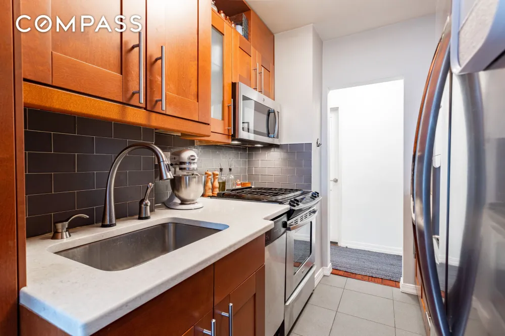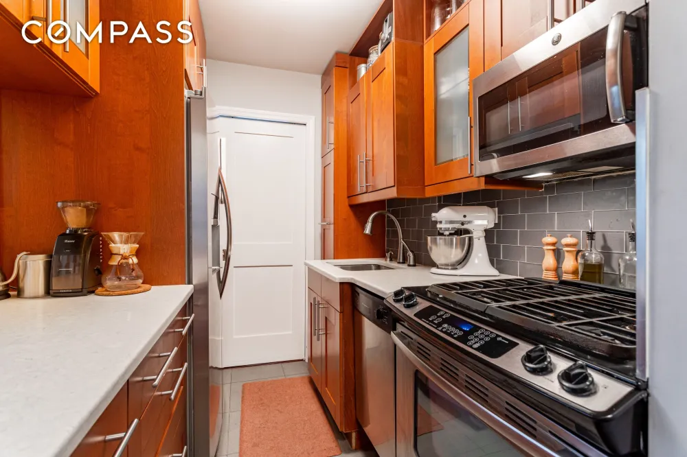 Gourmet Galley Kitchen: A chef's dream, featuring Caesarstone countertops, soft-close cabinets, a touch-operated faucet, and stainless steel appliances, including a gas oven, full-size refrigerator, and energy-efficient dishwasher. The breakfast bar is ideal for morning coffee or evening cocktails.