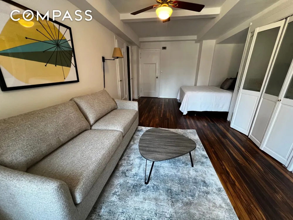 16th-floor studio for sale at Prospect Tower. This apartment features western exposure overlooking Tudor City Park with Chrysler Building views. The apartment contains a kitchenette with dishwasher, mini fridge, two burner cooktop and microwave oven. There are two closets and hardwood floors throughout. The bathroom is tiled.