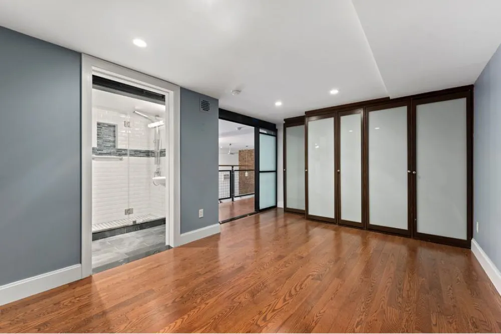 Welcome to a truly unique and air conditioned 2 bedroom apartment with 2 full baths. This apartment is the result of the owner combining two 1 bedroom apartments and gut renovating them in the last few years. You walk into the lower level which consists of a huge foyer with a built in desk (perfect for a home office), large closets, a cedar closet and a full separate laundry room with washer/dryer and a utility sink with additional storage, as well as a new bathroom. There are also 4 very large storage areas under the next level living area that are deep.Go up a few stairs to the open living room, dining room and kitchen, all with 11.5 feet ceilings and two same height sliders and windows (opening to Juliette balconies) facing south for tons of natural light. The kitchen is a gourmet cook's dream with stainless steel appliances, a 5 burner gas range and a very large attached island with a breakfast bar, all topped with granite. The kitchen wall is exposed brick. The open expanse is perfect for entertaining. Then, walk up the custom designed metal staircase with wood treads to the landing overlooking the living/dining room area. Off of this landing are 2 bedrooms with sliding opaque doors for privacy . The primary bedroom has an ensuite bathroom. Located at Penny Lane, one of the city's most unique buildings. This was the original home of the J.M. Horton Ice Cream Factory in the 1920's. Minutes from Gramercy Park and the Flatiron district, this apartment is 2 blocks from the 6 train and close to many chic restaurants and shops. The building features a 24-hour doorman, garage, lovely roof deck with incredible views, bike storage and additional storage units