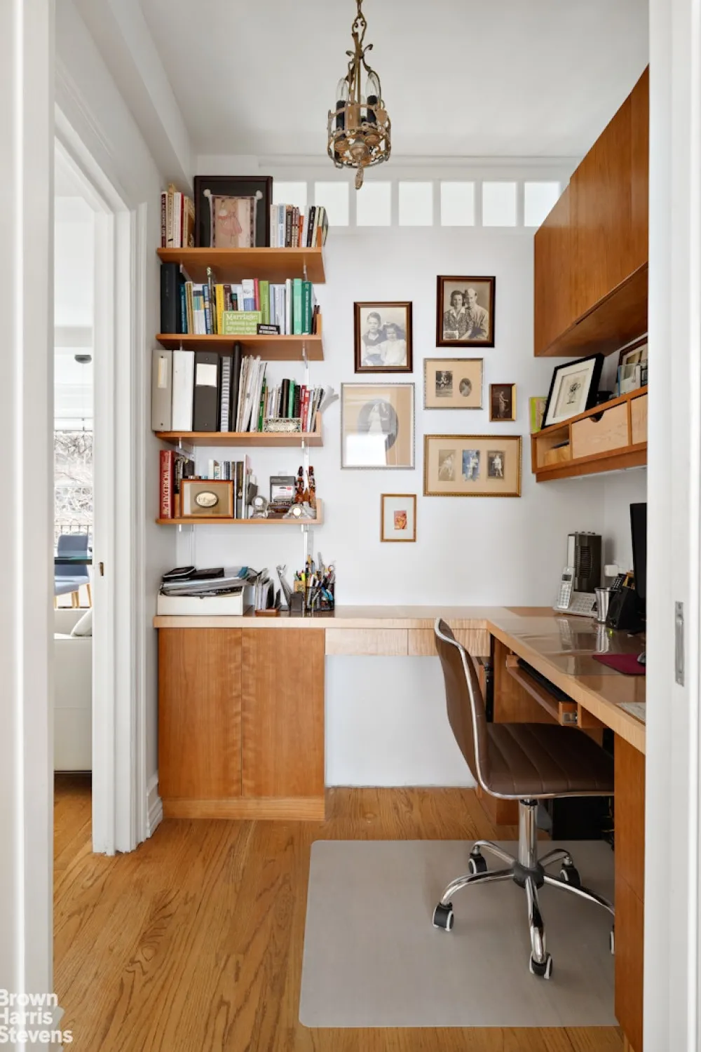 The primary bedroom boasts a beautiful white onyx marble-tiled en-suite bath, while the second bedroom-currently styled as a den with built-in bookcases-easily transforms into a private guest suite with sliding doors and its own full bathroom. A bonus room serves as a perfect home office, complete with custom cherry wood desk, shelving, and cabinetry.