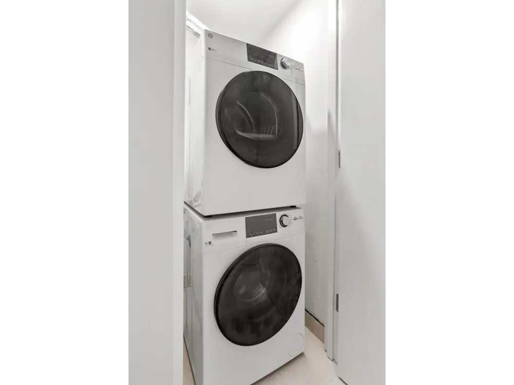 Swoon-worthy residence finishes include gorgeous 8" white oak flooring and lovely porcelain tile work. Custom fabricated cabinet doors from Nobilia make the kitchen pop and the integrated appliance package beautifully compliments the unique and stylish design. Trusted brands such as Fisher & Paykal, Bertazzoni, and GE make it a home chef's dream. Silestone Quartz countertops and high-end Grohe fixtures complete the aesthetic. A washer/dryer is included in-unit for the ultimate convenience as well as concealed Gree electric ducted split systems for maximum comfort year-round. High-end, full-height windows by Pella round out the modern design.
