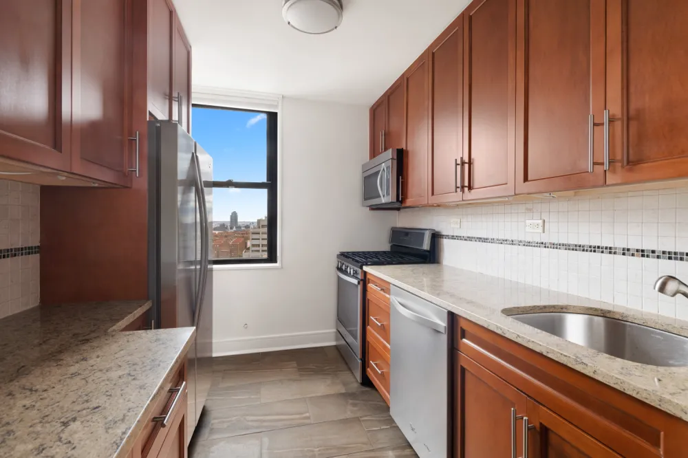 The spacious living area seamlessly accommodates a dedicated dining space, perfect for entertaining. The renovated galley kitchen features maple cabinets, stainless steel appliances, granite countertops, stone flooring, and a stylish glass and ceramic tile backsplash.