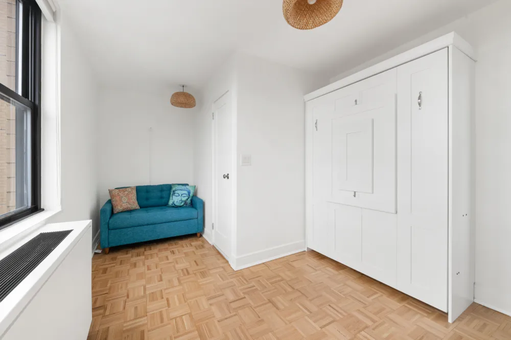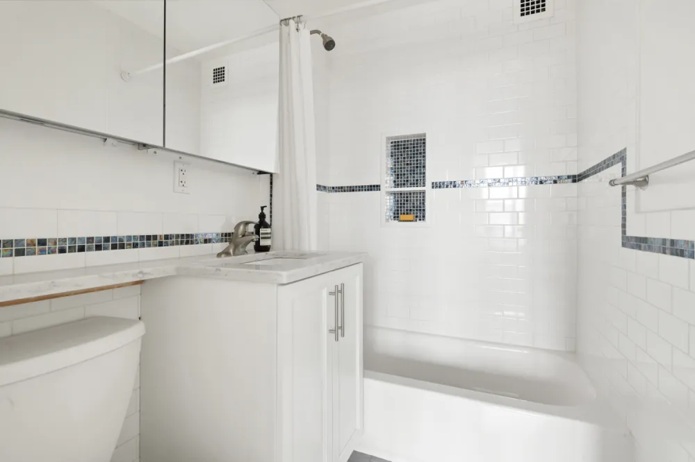 Retreat to the generously sized primary bedroom, which comfortably fits a king-sized bed and offers two ample closets. The en-suite bathroom showcases a timeless neutral palette with ceramic floors, a marble countertop, and white subway tiles accented with glass tiles. The second bedroom is perfect as a home office or nursery, thoughtfully outfitted with a versatile Murphy bed that maximizes space while offering flexibility and everyday convenience. An additional renovated bathroom features dark blue and white ceramic tiles with a quartz countertop. A large wall of closets in the entry hall provides abundant storage.