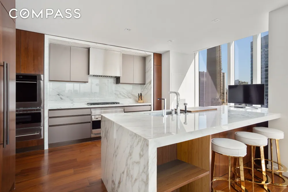 The Italian-crafted custom-designed Scavolini kitchen is open to the corner living room and outfitted with walnut cabinetry accented by champagne matte glass panels. Marble slab countertops and backsplash, polished chrome fixtures by Dornbracht, and a full suite of integrated professional appliances by Wolf, Miele, and Sub-Zero, as well as a Gaggenau wine refrigerator, beautifully finish the space.