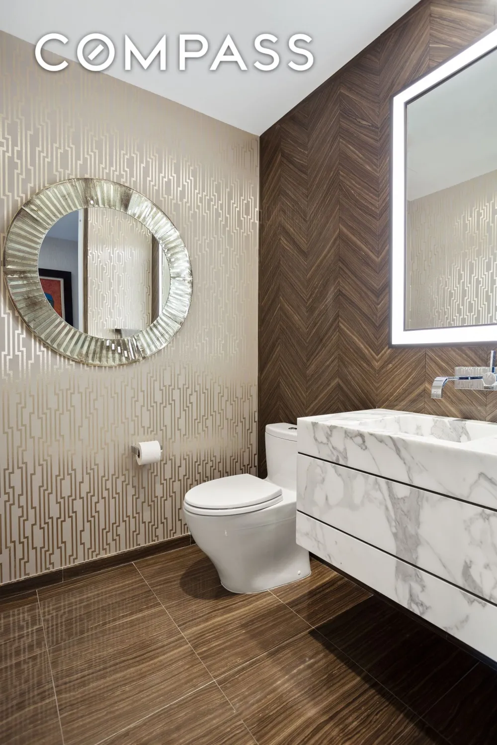 The south-facing corner primary bedroom features two oversized customized California walk-in closets and a luxurious en-suite five-fixture master bath complete with radiant heated Bianco Dolomiti marble floors, brushed limestone walls, marble slab countertop, Dornbracht fixtures, glass enclosed shower, and Zuma soaking tub. Three en-suite secondary baths are clad in Opal White marble floors and walls with Dornbracht fixtures and custom-stained oak vanities with Lacava countertops. A large laundry room, custom California walk-in foyer closet, and powder room featuring a Calacatta Fabricotti custom vanity with carved stone sink, Eramosa marble floor, and herringbone inlay accent wall complete this exquisitely-designed residence.