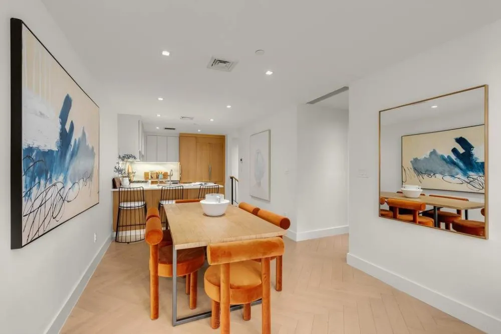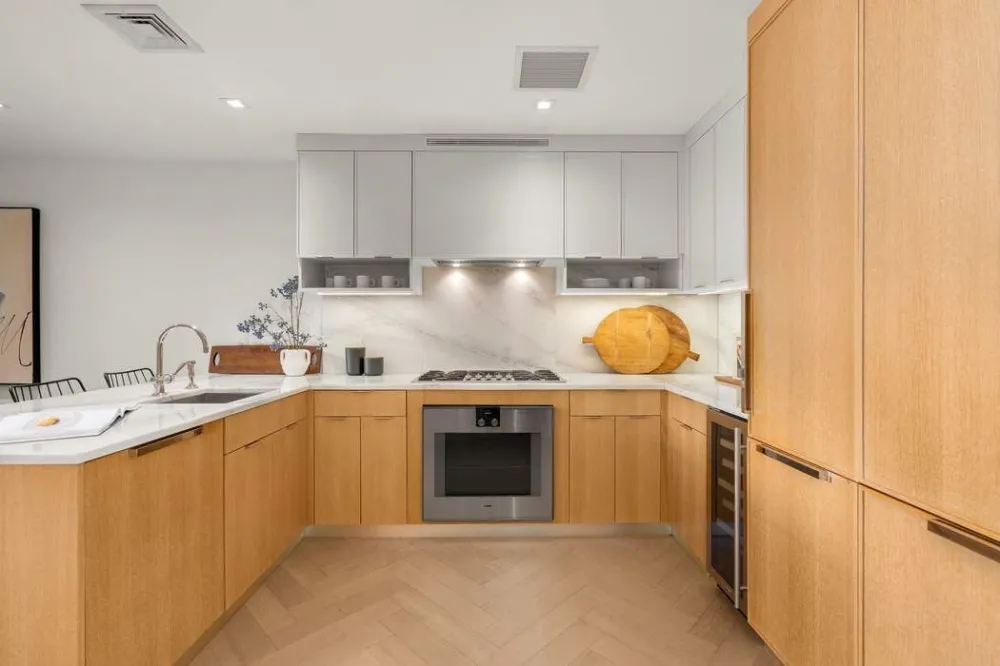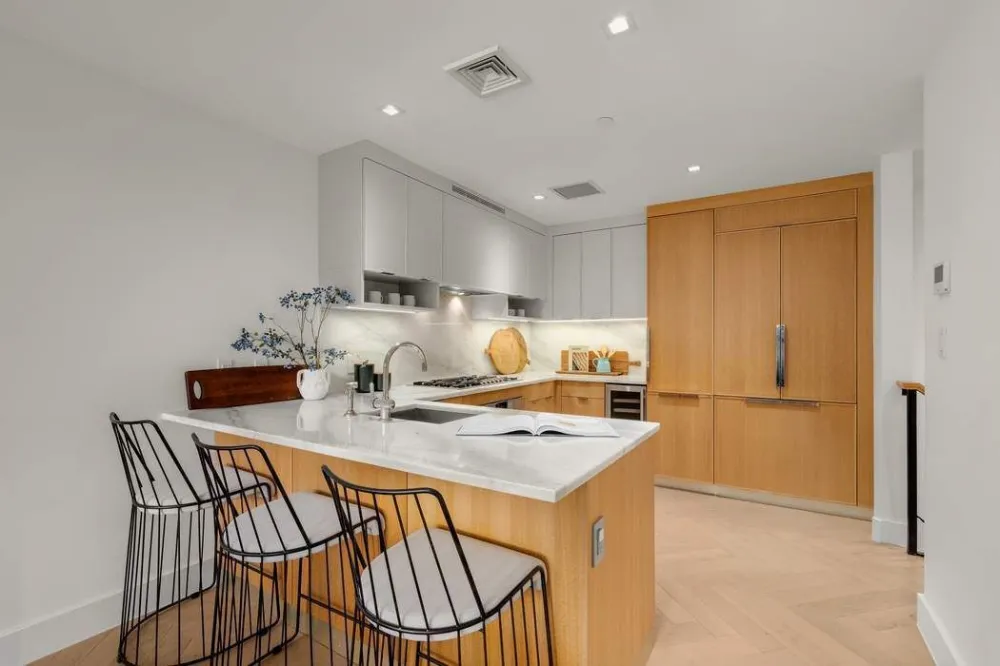 The sun-filled living and dining areas offer excellent volume and flow, anchored by a showpiece open Chef’s Kitchen appointed with top-of-the-line Gaggenau appliances, striking Calacatta marble countertops, custom cabinetry, a gas range, and in-sink disposal — making it a dream for both everyday cooking and elevated entertaining. So often we find functional and efficient spaces in new dev, but this large duplex exceeds expectations with true dedicated areas to host large dinner parties, large furniture pieces, several family members, etc.; it is the ultimate space to grow into.