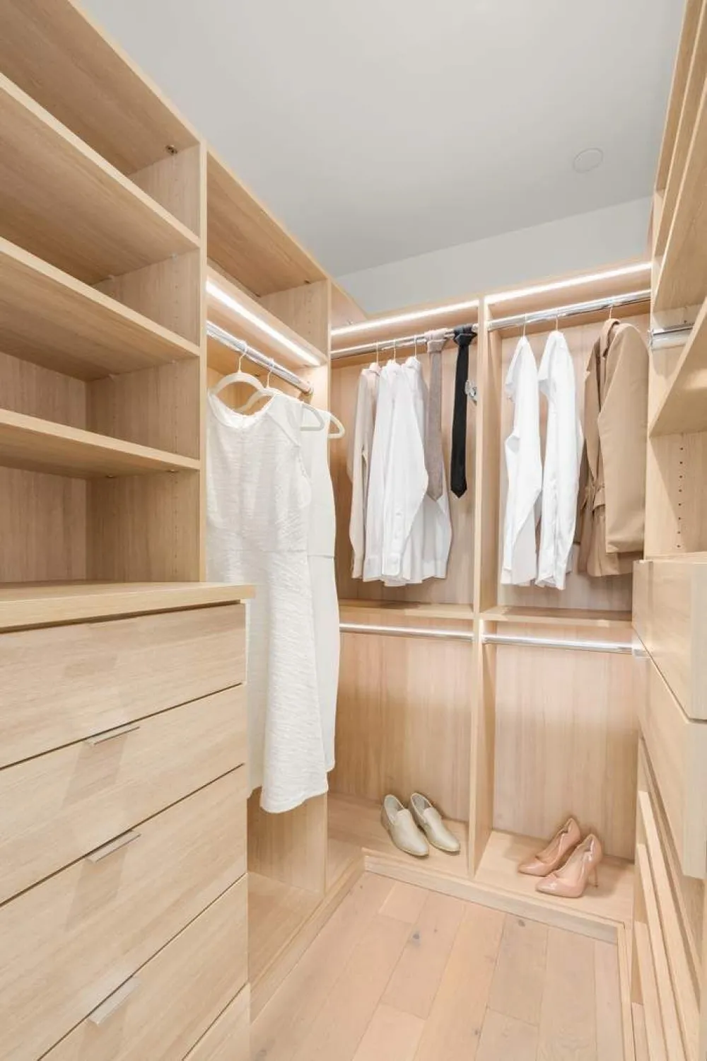 Custom California Closets throughout the home ensure optimal storage, including a spacious walk-in closet in the primary suite and a deep entry closet tailored to accommodate both everyday essentials and larger family items with ease. The main floor is thoughtfully curated with clean, modern lines, light oak herringbone hardwood floors throughout and and an airy open-plan design. Every detail has been considered for both beauty and comfort: Hunter Douglas blinds offer optimal light control and privacy, while radiant heated bathroom floors ensure year-round tranquility. Further, the home enjoys triple-glazed soundproof windows for a pin-drop experience in the home, and a high-performance Bosch washer/dryer in a large laundry room make daily living as seamless as it is refined.