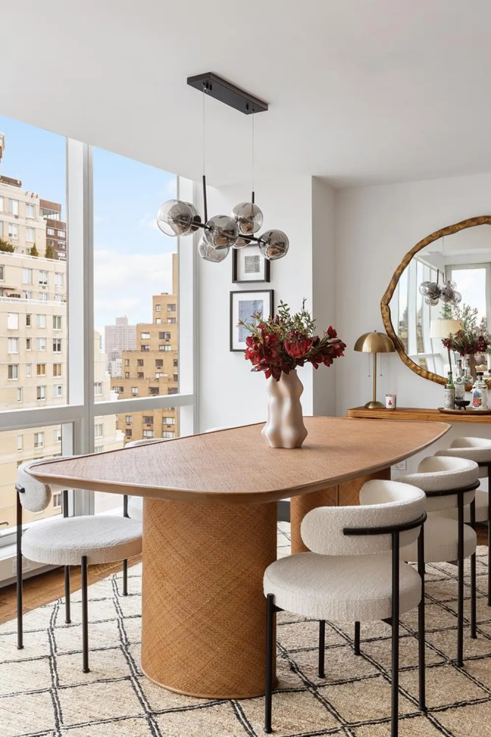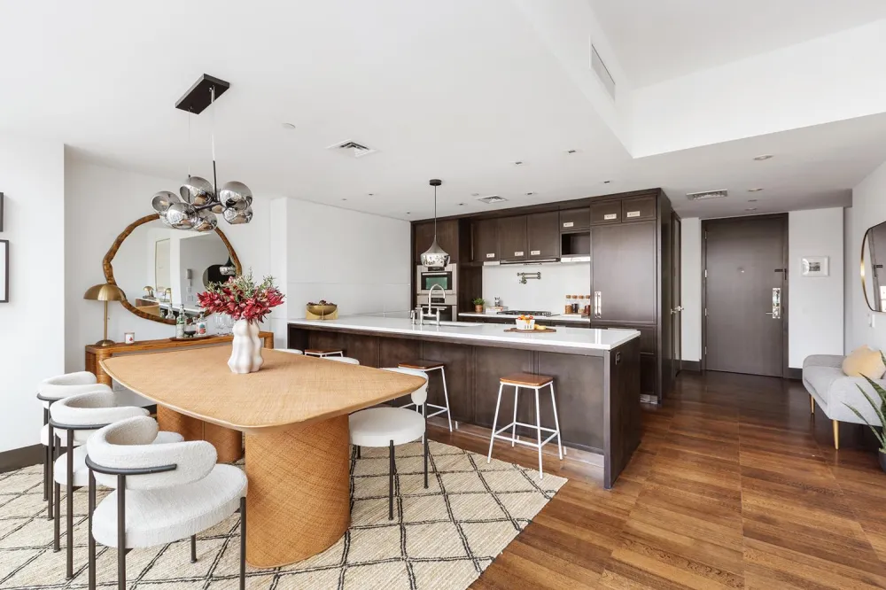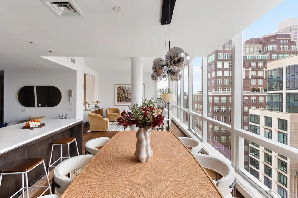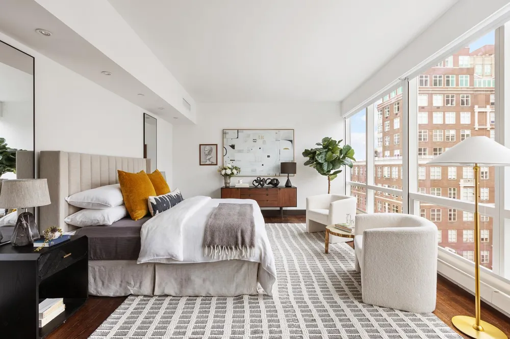This spacious 1,595 square foot home features expansive floor-to-ceiling windows, filling the space with natural light and offering a sense of openness, complemented by high ceilings and sleek oak hardwood floors throughout. The modern kitchen is designed for both style and functionality, equipped with top-tier appliances including a Sub-Zero refrigerator, Viking wine cooler, Miele dishwasher, double oven, and a Miele vented 6-burner cooktop. The generously sized primary bedroom boasts custom closets and an en-suite spa-like bathroom with a deep soaking tub, a stall shower, double vanity, and radiant floor heating. The secondary bedroom is equally spacious, offering a custom closet and a beautifully designed marble en-suite bathroom. A convenient 1/2 bathroom is located off the hallway, along with a full-size washer and dryer, a central heating and cooling system. Custom, motorized window treatments throughout. This unit also includes a coveted storage bin.