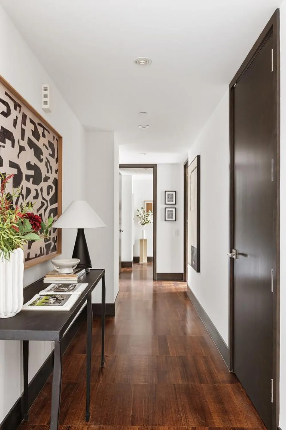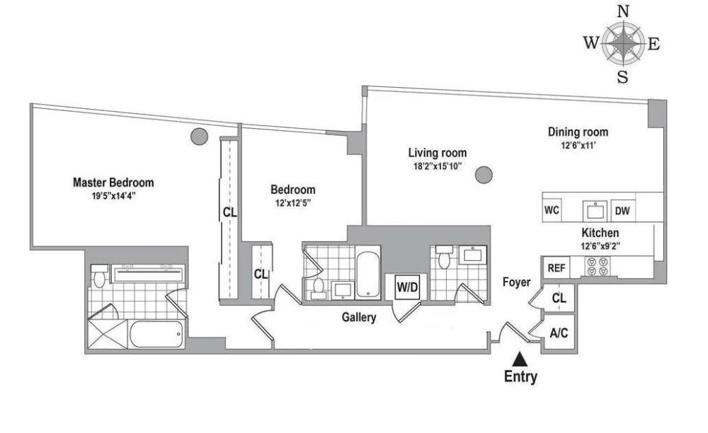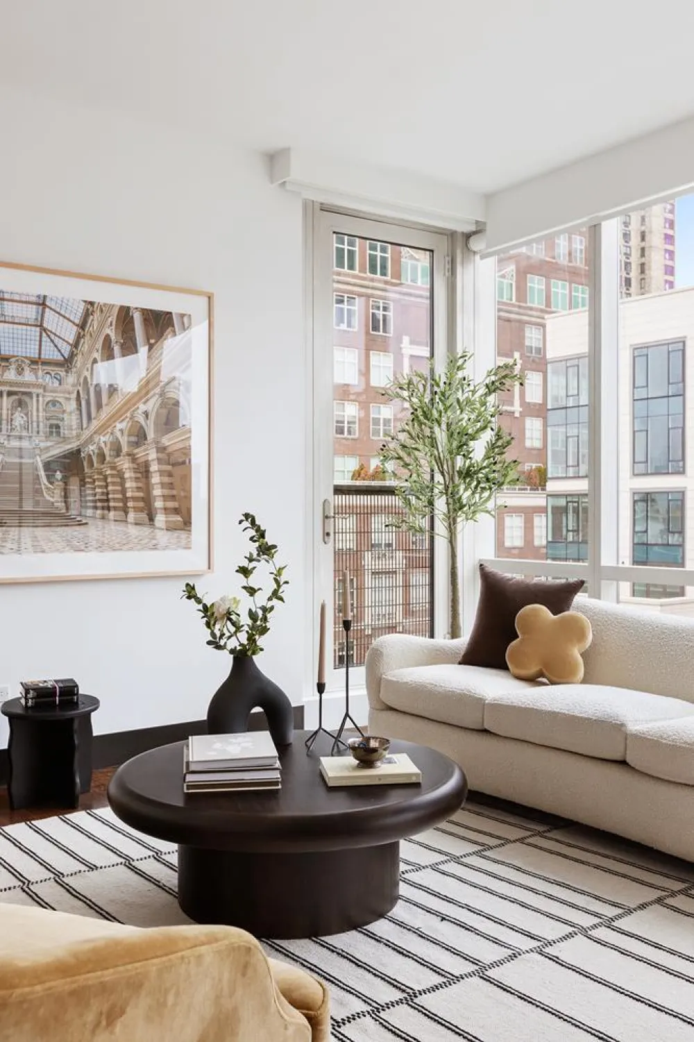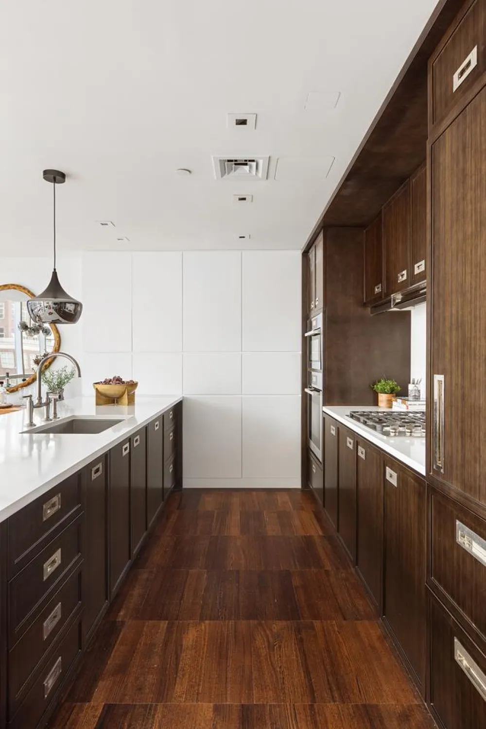 This spacious 1,595 square foot home features expansive floor-to-ceiling windows, filling the space with natural light and offering a sense of openness, complemented by high ceilings and sleek oak hardwood floors throughout. The modern kitchen is designed for both style and functionality, equipped with top-tier appliances including a Sub-Zero refrigerator, Viking wine cooler, Miele dishwasher, double oven, and a Miele vented 6-burner cooktop. The generously sized primary bedroom boasts custom closets and an en-suite spa-like bathroom with a deep soaking tub, a stall shower, double vanity, and radiant floor heating. The secondary bedroom is equally spacious, offering a custom closet and a beautifully designed marble en-suite bathroom. A convenient 1/2 bathroom is located off the hallway, along with a full-size washer and dryer, a central heating and cooling system. Custom, motorized window treatments throughout. This unit also includes a coveted storage bin.
