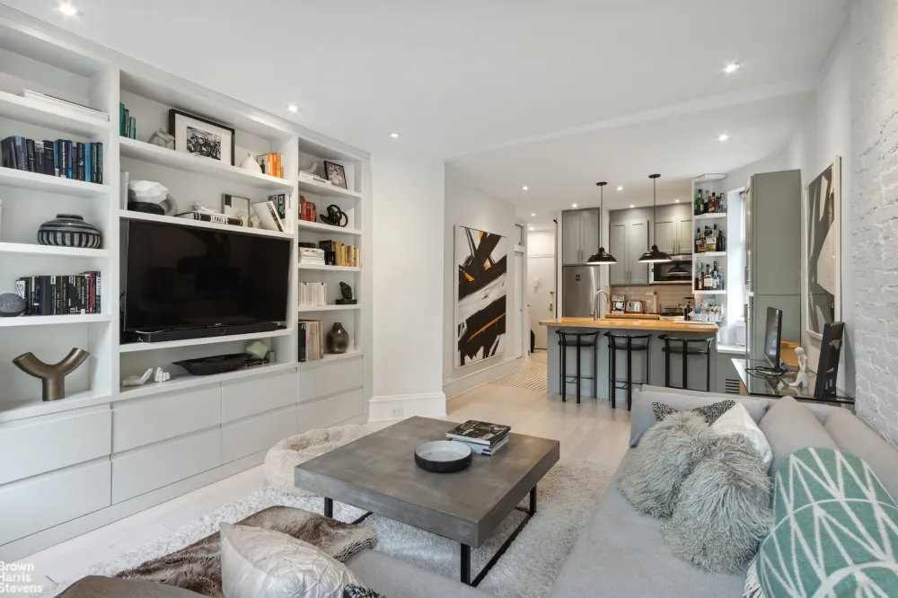 This fully renovated corner apartment has sunshine streaming through 7 windows all day. Large Open Living room with exposed brick and custom wall-to-wall built-in bookcases creates a perfect space for entertaining. In addition Eat-in kitchen with large peninsular Island fitted with Stylish butcher block countertops and custom built in floating bar shelves helps create a perfect space for morning coffee or a fun gathering.