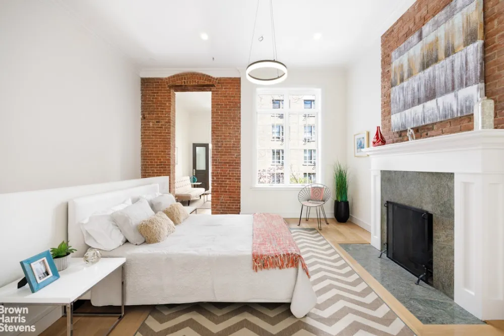 Upstairs is a spacious primary bedroom with 12" ceilings and an en-suite bath. There is an adjacent smaller 2nd bedroom / office on this level with a private balcony overlooking the garden. A second fireplace & partially exposed brick walls add to the charm and pre-war details.