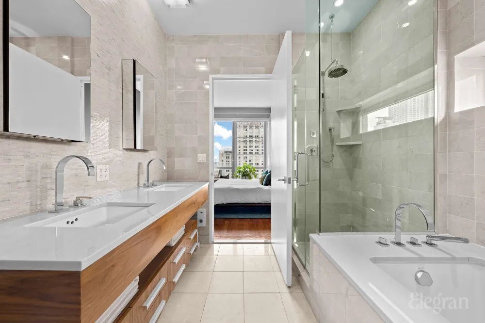 The en-suite bathroom is a serene retreat, featuring Crystal Beige stone countertops, Crema Marfil stone floors, a double-sink walnut vanity, Toto water closet, polished chrome Dornbracht fixtures, and a Zuma whirlpool tub. The second bathroom continues the theme of luxury with Bianco Carrara marble throughout, complemented by a walnut wood vanity, Dornbracht fixtures, and a separate glass-enclosed shower.