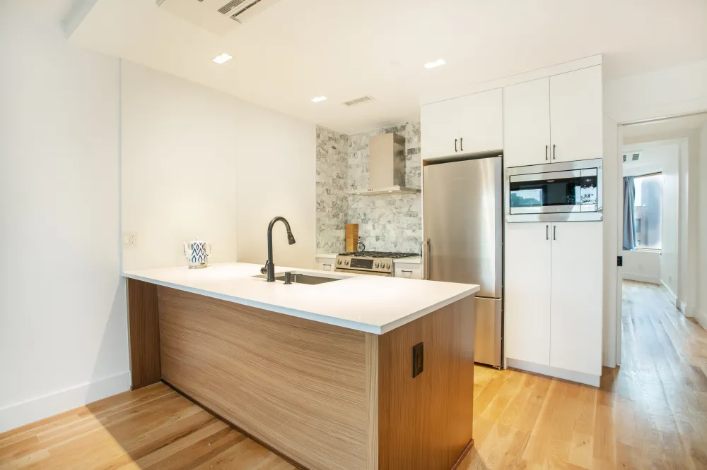 Enter a sun-drenched, large living space which flows seamlessly to a sleek open kitchen. Outfitted with high-end appliances including a custom Liebherr refrigerator, Bosch Ascenta dishwasher, Bosch gas range, GE microwave, and a Whirlpool wall-mounted chimney hood, the kitchen exudes both function and flair. A Calacatta Cressa honed marble subway tile backsplash, Elkay Crosstown stainless steel undermount sink, custom white cabinetry with Treefrog walnut veneer, and pure white quartz countertops complete the clean, modern aesthetic.