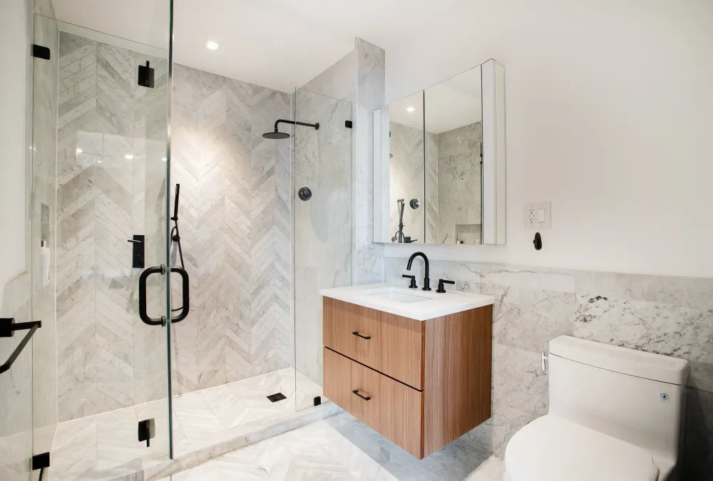 Separately winged bedrooms allow for flexible lifestyle options. Down a storage-rich hall, indulge in the luxury of an oversized primary bedroom complete with a spacious private balcony overlooking the treetops. The spa-like ensuite bathroom is outfitted with grey Carrara chevron mosaic marble floors, heated floors, custom glass shower, Toto toilet, Phylrich matte black fixtures, custom vanity, and marble walls.