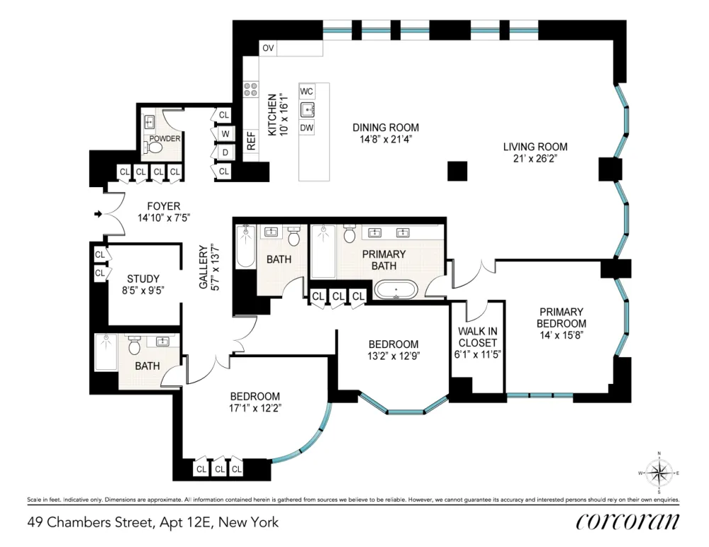 This exceptional 2,975 square foot home offers three bedrooms plus a home office/bonus room and three and a half baths. Nestled within one of Manhattan's premier Beaux-Arts landmarks, 49 Chambers is the epitome of sophistication and timeless luxury in Manhattan's evolving downtown landscape. When you enter the home, grand double doors lead to an elegant foyer, complete with a powder room, generous closet space and washer dryer. The thoughtful open layout maximizes the high ceilings while seamlessly integrating the kitchen into the gracious living and dining spaces. The gourmet kitchen features custom cypress millwork complemented by luxurious honed San Marino marble countertops. Premium appliances include SubZero refrigeration, Gaggenau gas cooktop with hood, Wolf dual convection oven with warming drawer, Miele dishwasher, and dedicated wine storage. Two walls of windows flood the apartment with natural light offering unobstructed city views to the North and East. The king sized primary suite offers an elegant retreat with oversized bay windows, elevated ceilings, and an expansive, built-in walk in closet. The five-fixture primary bath creates the ambiance of a luxurious spa with honed Ariel White marble throughout, custom Apaiser stone double vanities, light-framed crowned mirrors, an elegant Apaiser stone tub, and radiant heated floors.