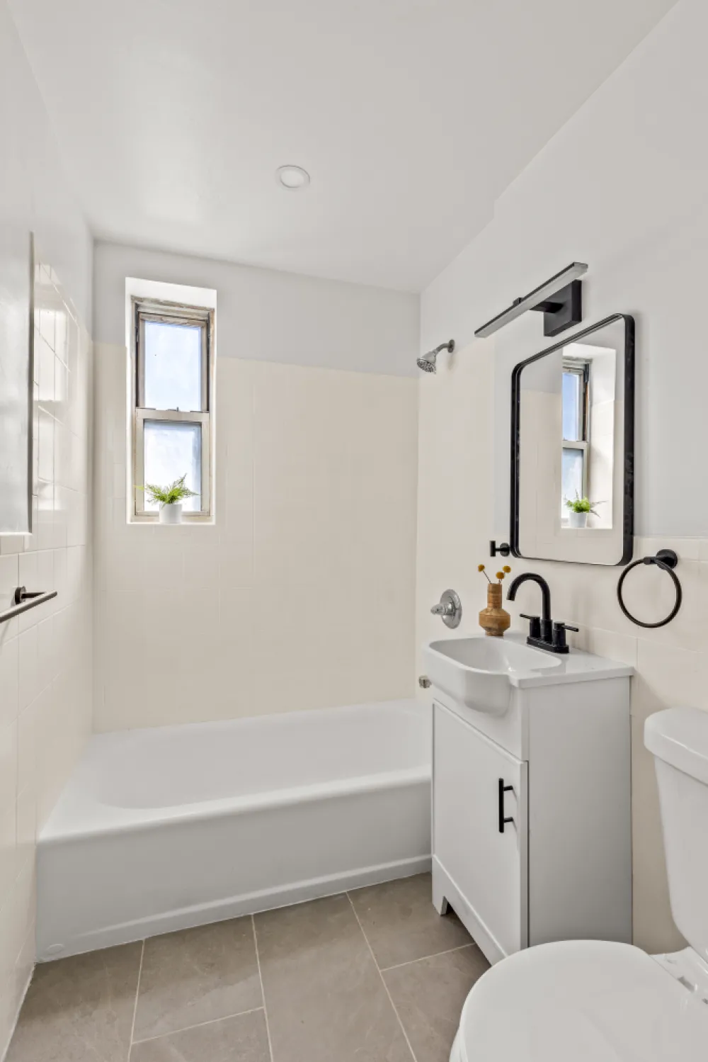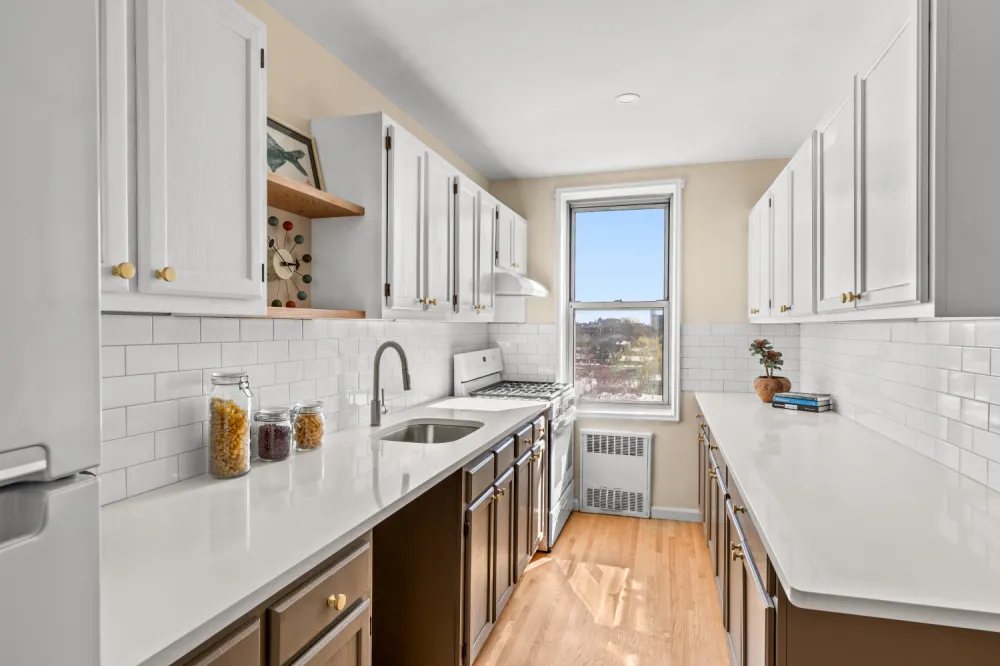 The newly renovated windowed kitchen is a standout, featuring a clean, modern design with white quartz countertops, a subway tile backsplash, and ample cabinet space to satisfy any home chef.