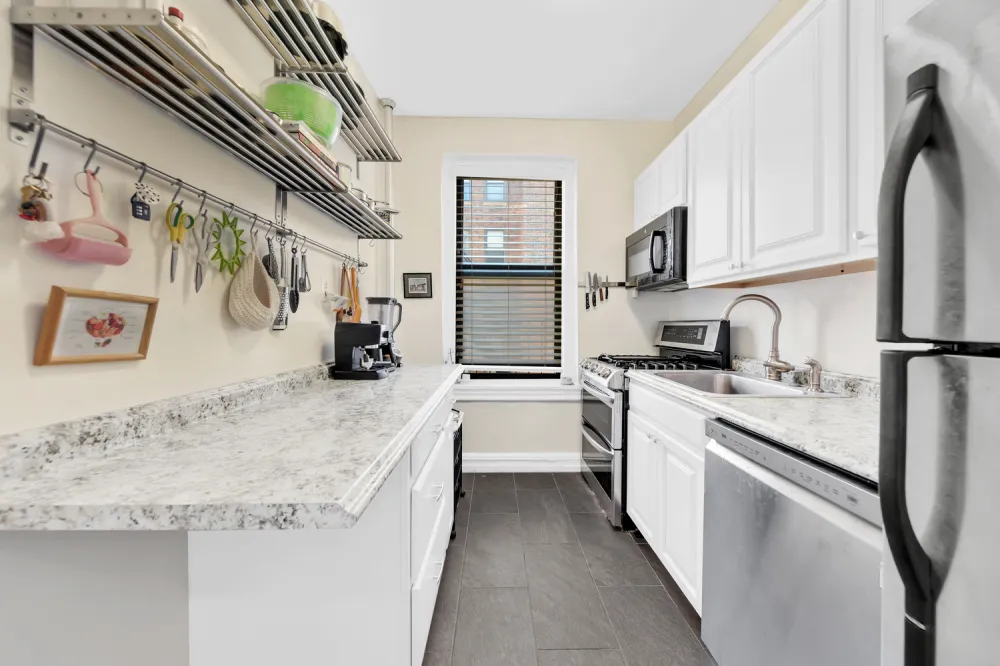 This wonderfully bright apartment on the fourth floor features a spectacular layout and charming pre-war details such as high ceilings, and refinished parquet hardwood floors that glisten in the sunlight. The windowed galley kitchen has been remodeled with a breakfast bar, new floor, chef's rack, new cabinets and stainless steel appliances including a dishwasher. The bedroom is king sized allowing for large furniture and has 2 great sunny exposures from three windows. The apartment also features two well sized closets; the main one renovated and combined with additional top storage.