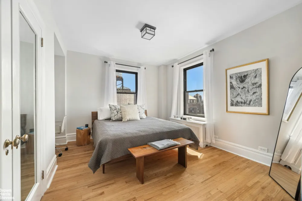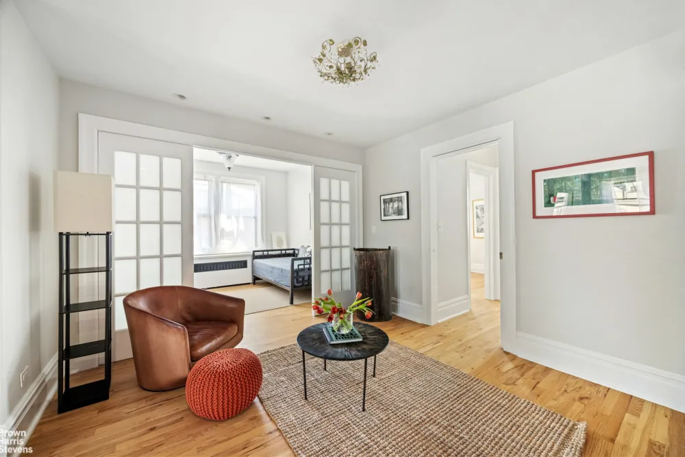 Additional highlights include hardwood floors, recessed lighting, updated electrical, and charming French doors that add a thoughtful contemporary edge to the home's prewar elegance. Bike storage and additional storage bins are available.