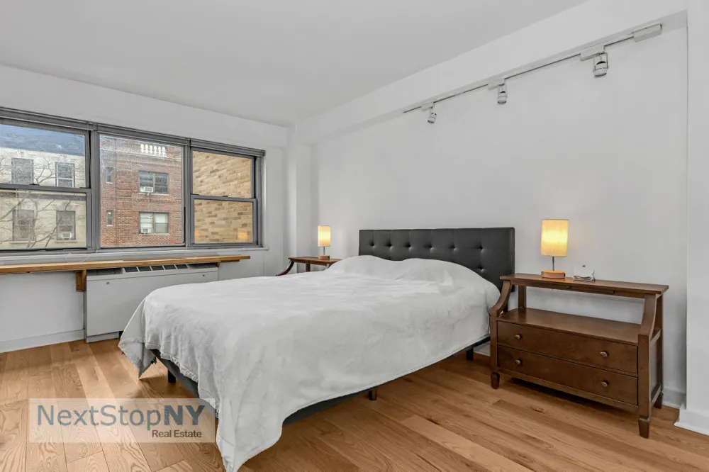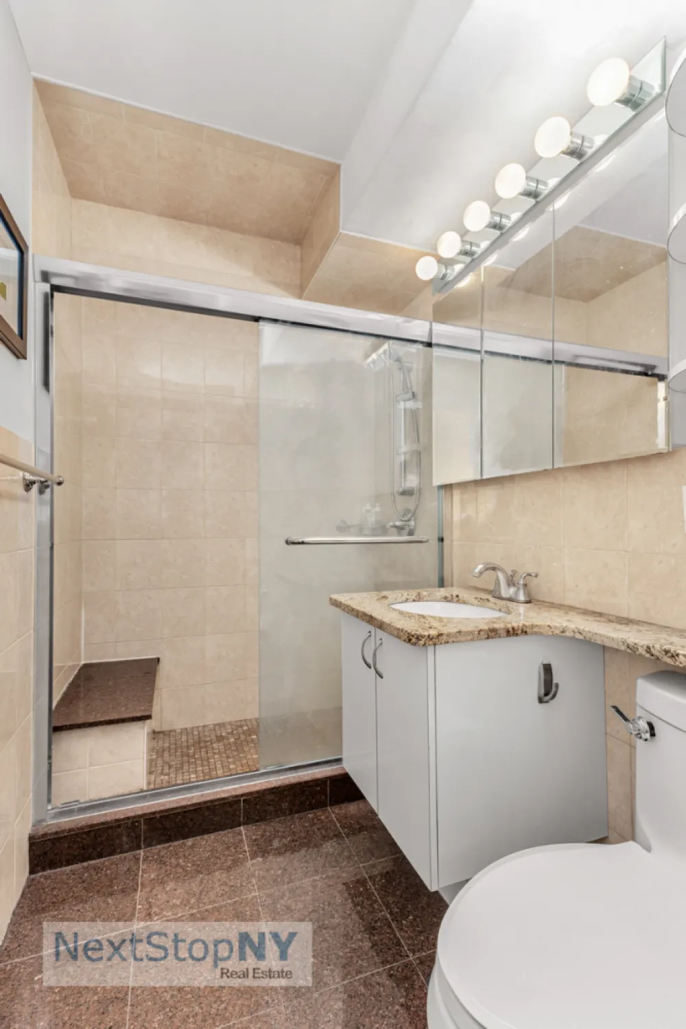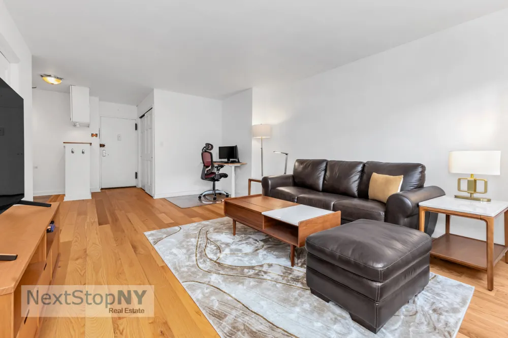 The kitchen features stainless steel appliances, and the marble bathroom is equipped with a stand-in shower stall. A thoughtfully designed dining area off the kitchen maximizes space efficiency, while new hardwood floors are featured throughout the apartment. Additionally, the unit boasts excellent closet space.
