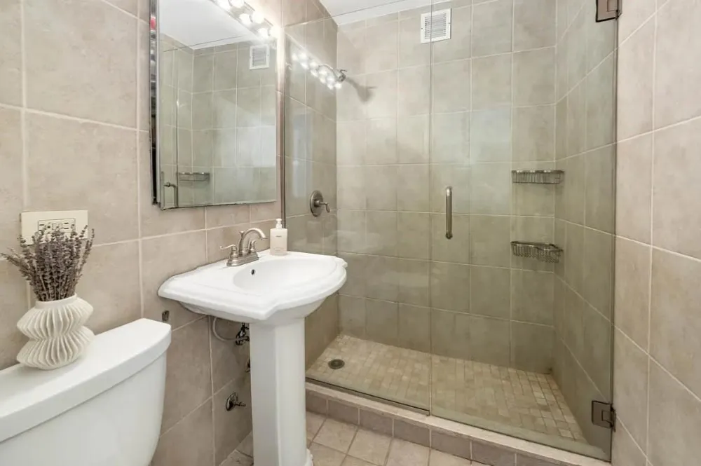 In the primary bedroom, you will find enough space to easily fit a king-sized bed, while the huge closet, complete with custom shelving, ensures ample storage for your wardrobe and other essentials. The bathroom is finished with elegant stone tiles, a glass door, and plentiful storage. With hardwood floors throughout and built-in air conditioning, this apartment combines modern updates with classic charm in a prime location.
