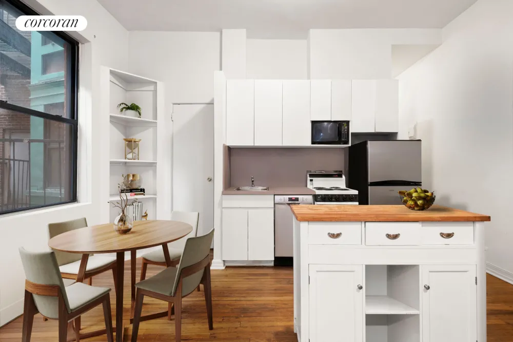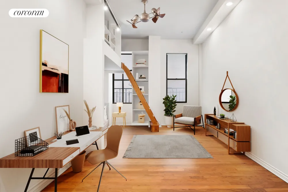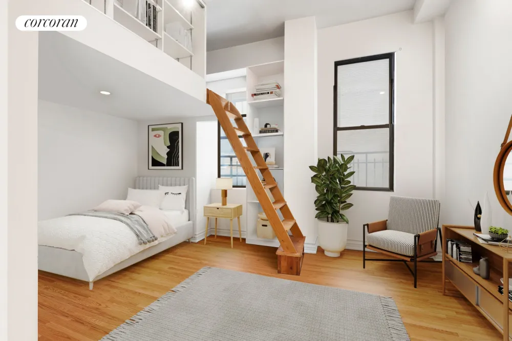 The open kitchen can easily accommodate dining table & chairs. The elevated loft area is ingeniously designed to accommodate separate sleeping and work areas - while the elegant foyer provides a gracious entry point which is gently separated from the living area. Original prewar details have been maintained throughout while finishing touches such as modern lighting and contemporary design provide the perfect updates. No detail has been omitted!