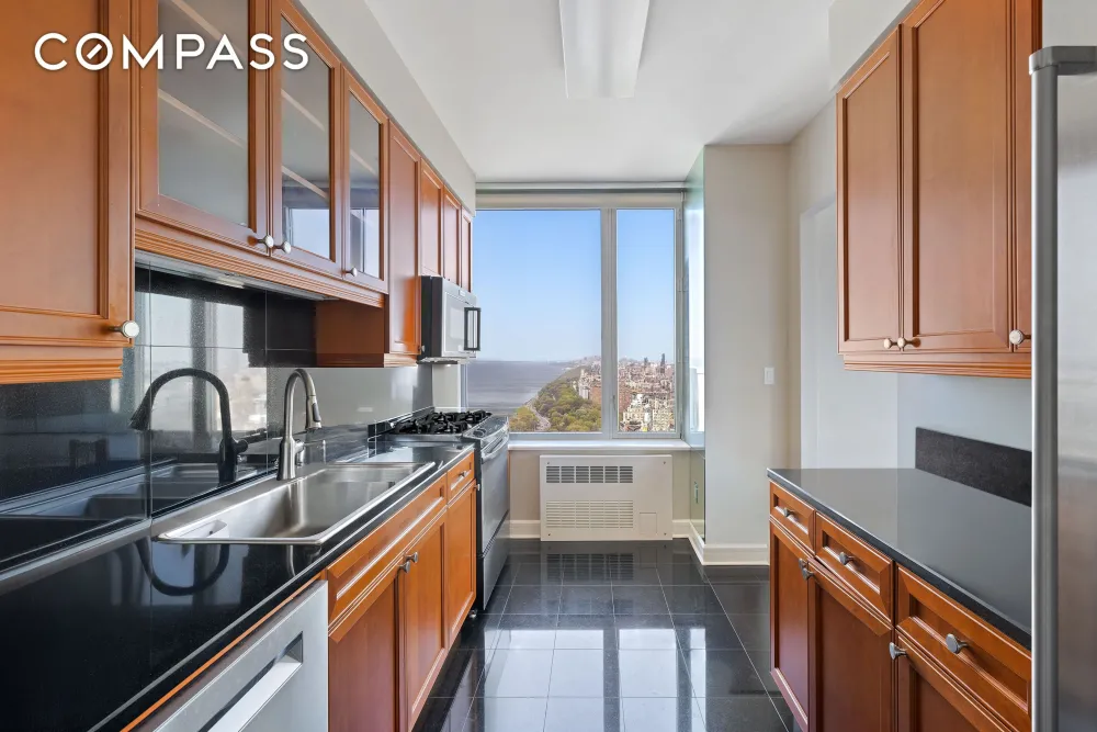 The windowed kitchen is a chef’s delight, boasting solid wood cabinetry, sleek black granite countertops and floors, and a full suite of stainless-steel appliances. Enjoy serene vistas of Riverside Park and the Hudson River as you prepare meals.