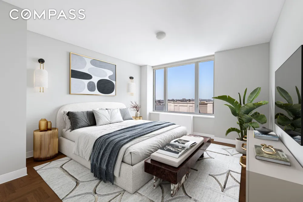 Both bedrooms comfortably accommodate king-sized beds. The primary suite features generous closet space and a luxurious marble-clad en-suite bath complete with a soaking tub and separate glass-enclosed shower. The second bedroom enjoys dramatic Upper West Side views and easy access to the second full bathroom.
